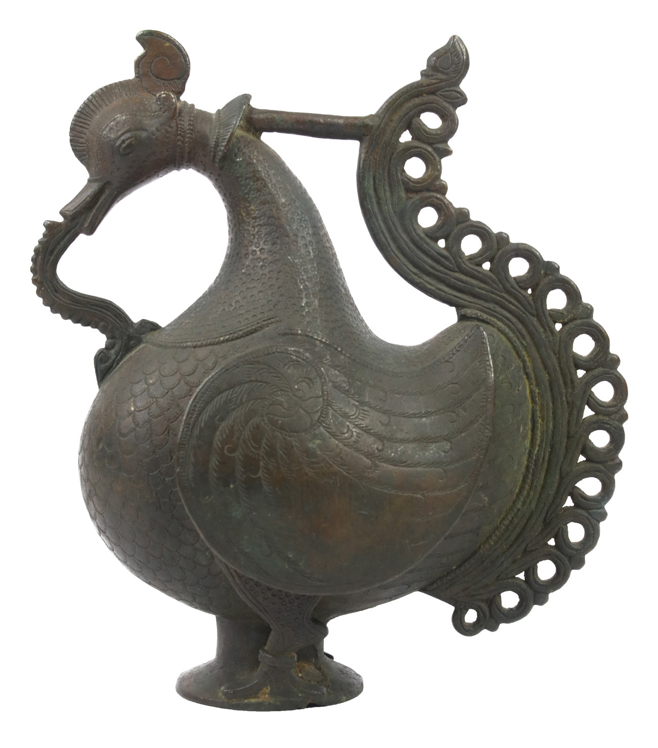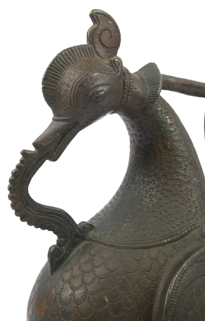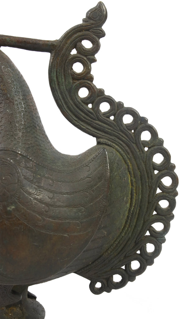 Read MoreThis is a very finely engraved and rare, cast bronze, Deccan Hamsa oil lamp finial from North Karnataka or Andhra Pradesh. The branch Hamsa holds in its beak is probably a branch of Sanjeevini, which is held to be a medicinal plant in Hindu mythology that revives life. The wings and body of the bird are engraved with feather designs and the tail is an elegant open scrollwork. Birds or Hamsas like this were used as decorative elements on the top of oil lamps as containers for the oil.