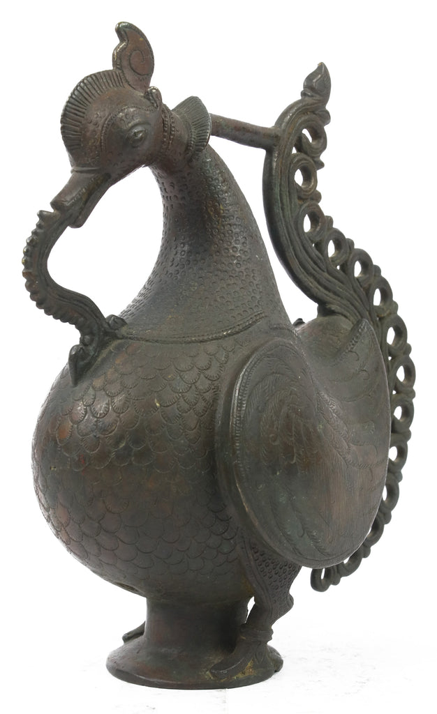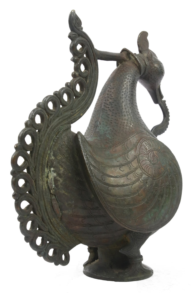 In this piece, an internal mechanism would have allowed the oil to pass, drop by drop, through a narrow, often faceted, spout on the breast of the bird (missing here but the clean cut hole can be seen) into the bowl with the wicks beneath. Comparable examples can be seen in Mark Zebrowski's "Gold, Silver and Bronze from Mughal India", cat.93-95, p.98.