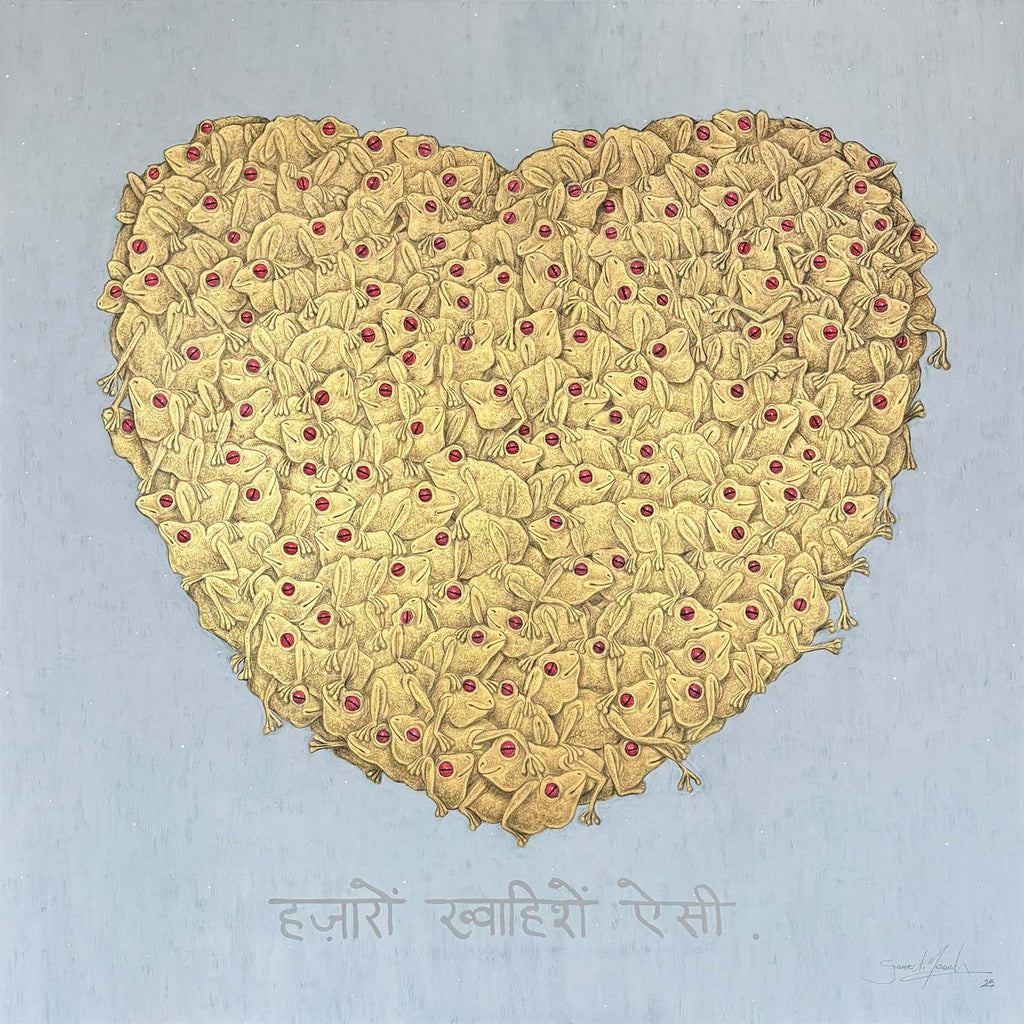 Gurmeet’s work is based on narratives at two levels - the personal and the societal. The images are sarcastic expressions that have their origin in deeply felt emotions. In a way, the satire inherent in his work serves to resolve inner conflicts. Desire is a fundamental aspect of his art, which has many forms, such as the explosion and the entrapment of the heart.