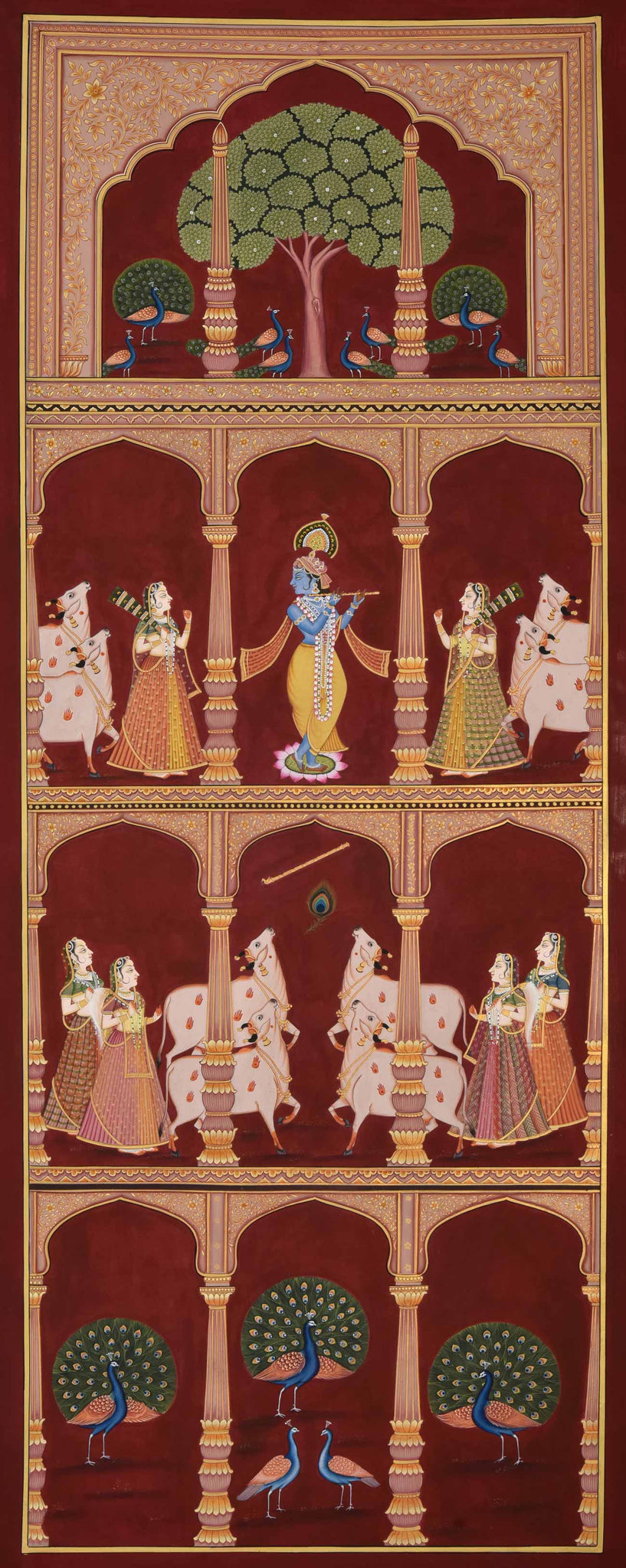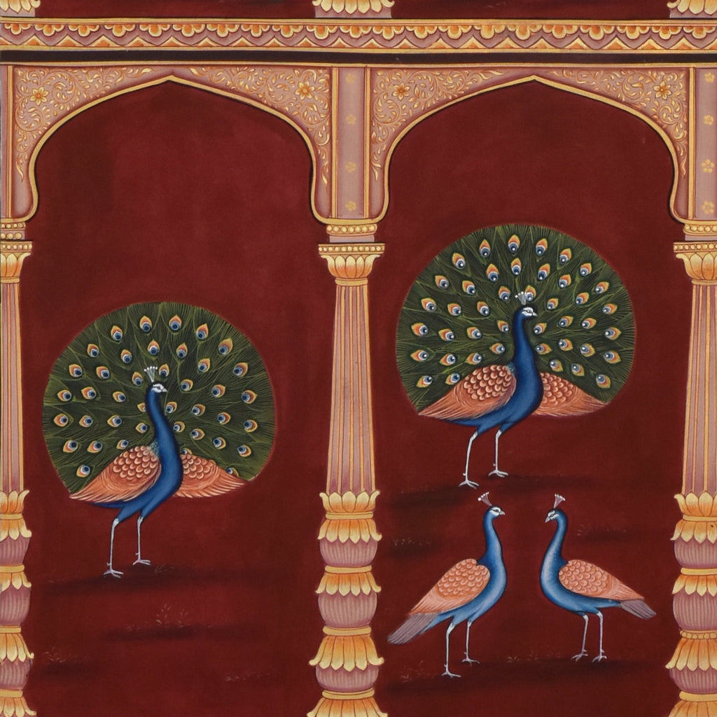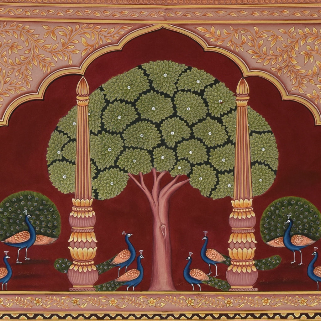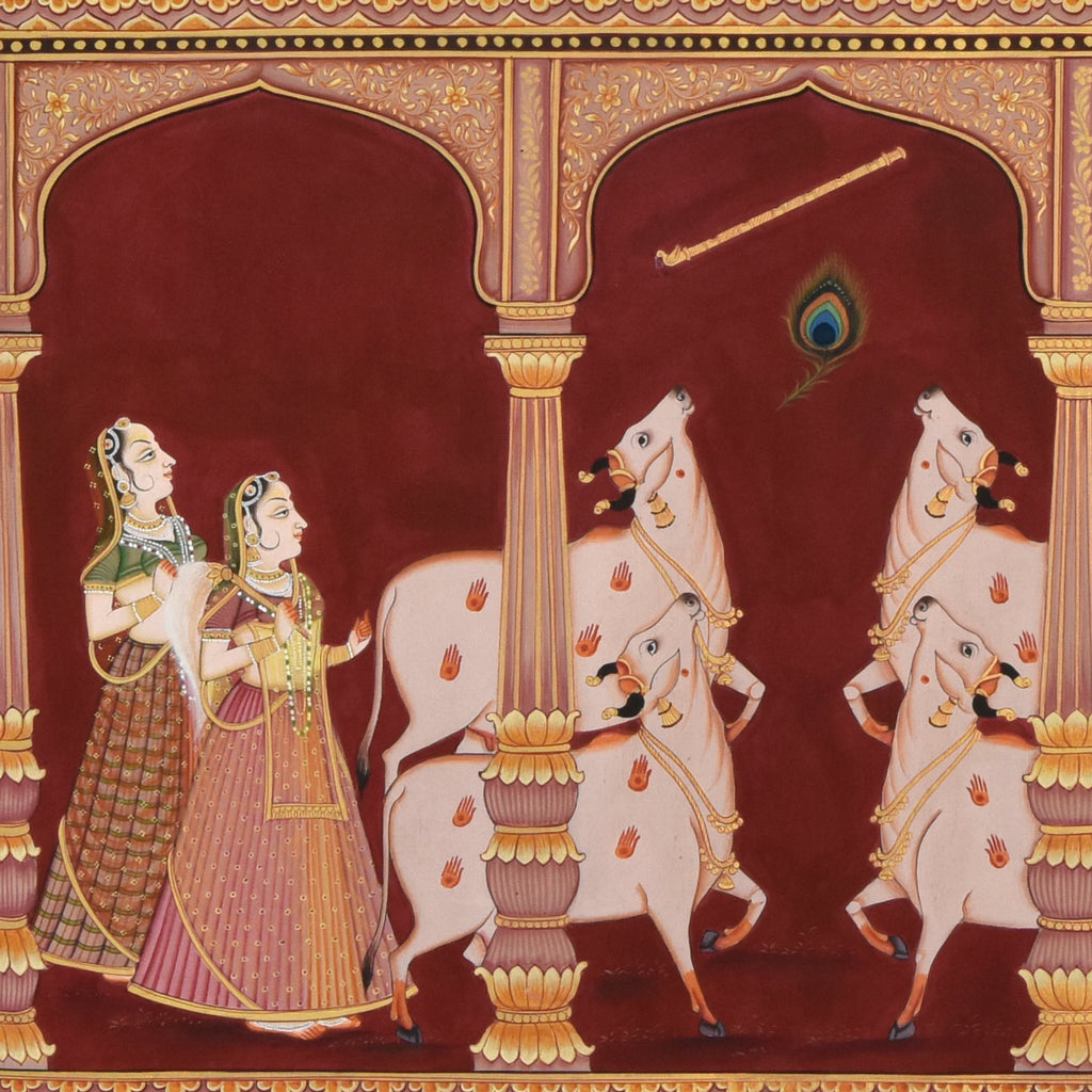 Pichwais are best framed with regular or non-reflective glass. Artworks should be displayed away from direct sunlight and breeze. To clean any accumulated dust, use a soft, dry brush or cloth very lightly on the glass surface or the frame. Make sure there is no moisture on the brush or cloth before cleaning the surface. Once a year, remove the artwork from the wall for a couple of days to let the wall breathe and avoid moisture accumulation. Minor discolouration over the years is normal and to be expected. -