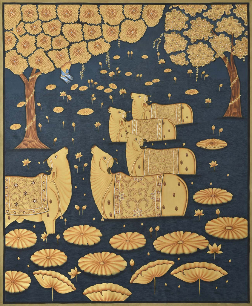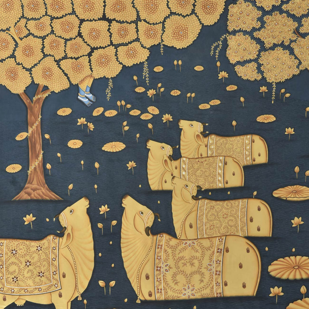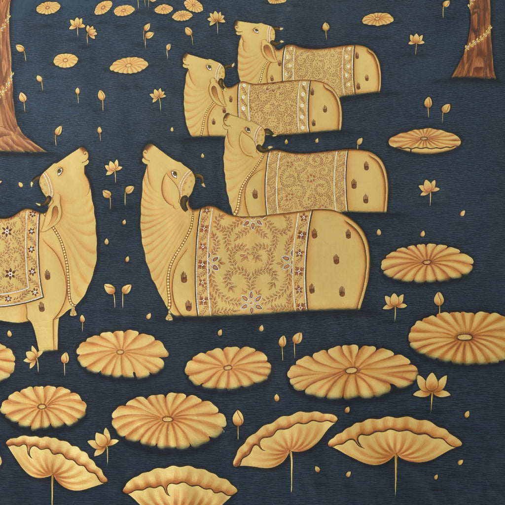 Pichwais are best framed with regular or non-reflective glass. Artworks should be displayed away from direct sunlight and breeze. To clean any accumulated dust, use a soft, dry brush or cloth very lightly on the glass surface or the frame. Make sure there is no moisture on the brush or cloth before cleaning the surface. Once a year, remove the artwork from the wall for a couple of days to let the wall breathe and avoid moisture accumulation. Minor discolouration over the years is normal and to be expected. -