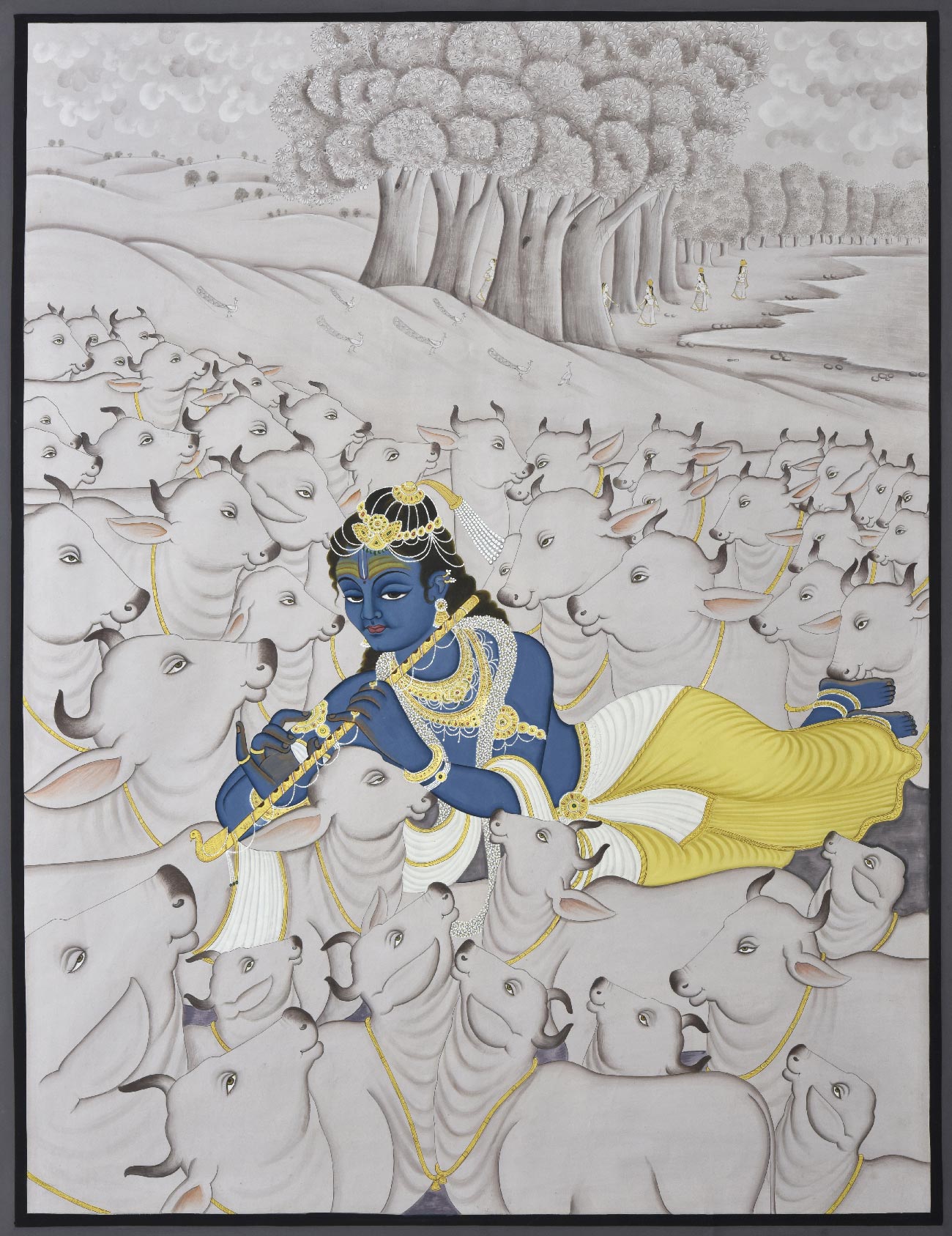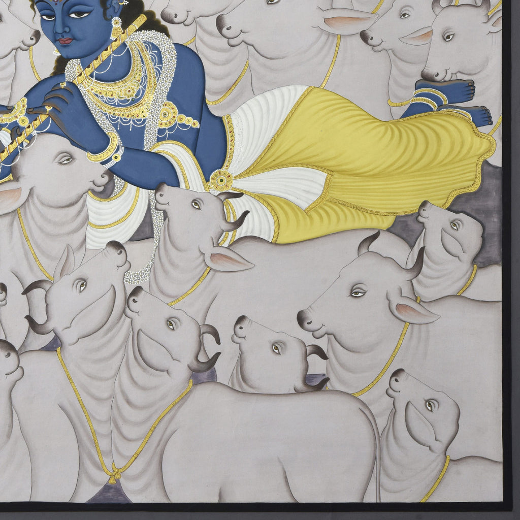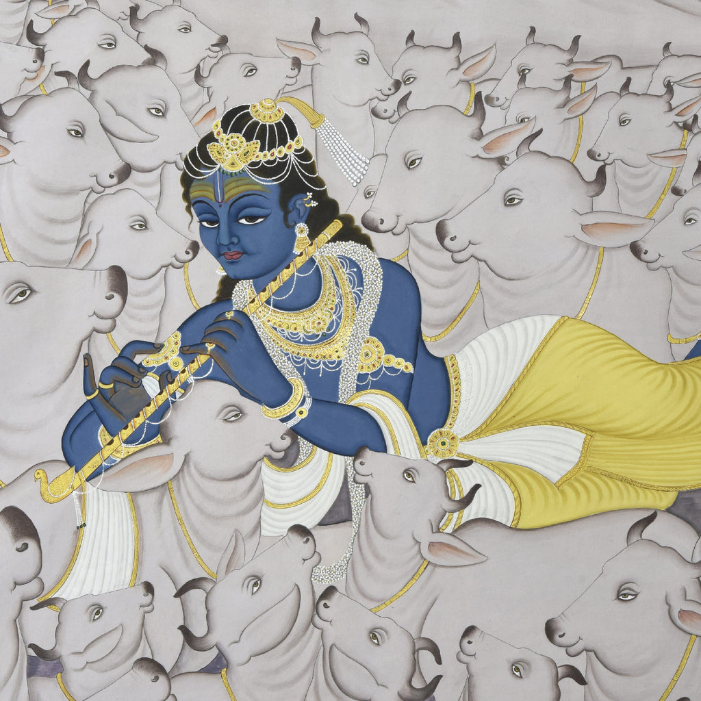 Read MorePichwai (pichvai) is a style of painting that originated over 400 years ago, in the town of Nathdwara near Udaipur in Rajasthan, India. Intricate and visually stunning, pichwai paintings, made on cloth, depict tales from Lord Krishna's life. Creating a pichwai can take several months, and requires immense skill, as the smallest details need to be painted with precision. Lord Krishna is often depicted as Shrinathji in Pichwais, which is the deity manifest as a seven-year-old child. Other common subjects found in pichwai paintings are Radha, gopis, cows and lotuses. Festivals and celebrations such as Sharad Purnima, Raas Leela, Annakoot or Govardhan Puja, Janmashtami, Gopashtami, Nand Mahotsav, Diwali and Holi are frequently depicted in Pichwais.