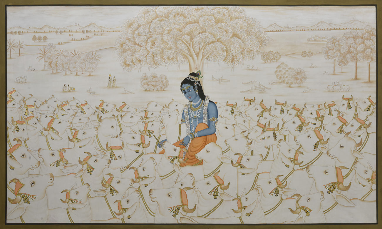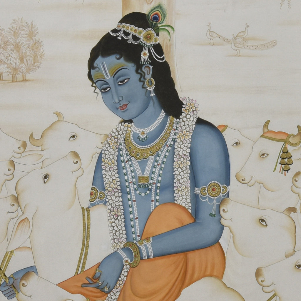 Read MorePichwai (pichvai) is a style of painting that originated over 400 years ago, in the town of Nathdwara near Udaipur in Rajasthan, India. Intricate and visually stunning, pichwai paintings, made on cloth, depict tales from Lord Krishna's life. Creating a pichwai can take several months, and requires immense skill, as the smallest details need to be painted with precision. Lord Krishna is often depicted as Shrinathji in Pichwais, which is the deity manifest as a seven-year-old child. Other common subjects found in pichwai paintings are Radha, gopis, cows and lotuses. Festivals and celebrations such as Sharad Purnima, Raas Leela, Annakoot or Govardhan Puja, Janmashtami, Gopashtami, Nand Mahotsav, Diwali and Holi are frequently depicted in Pichwais.