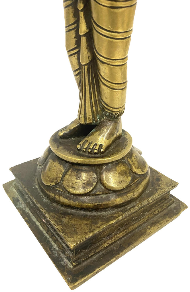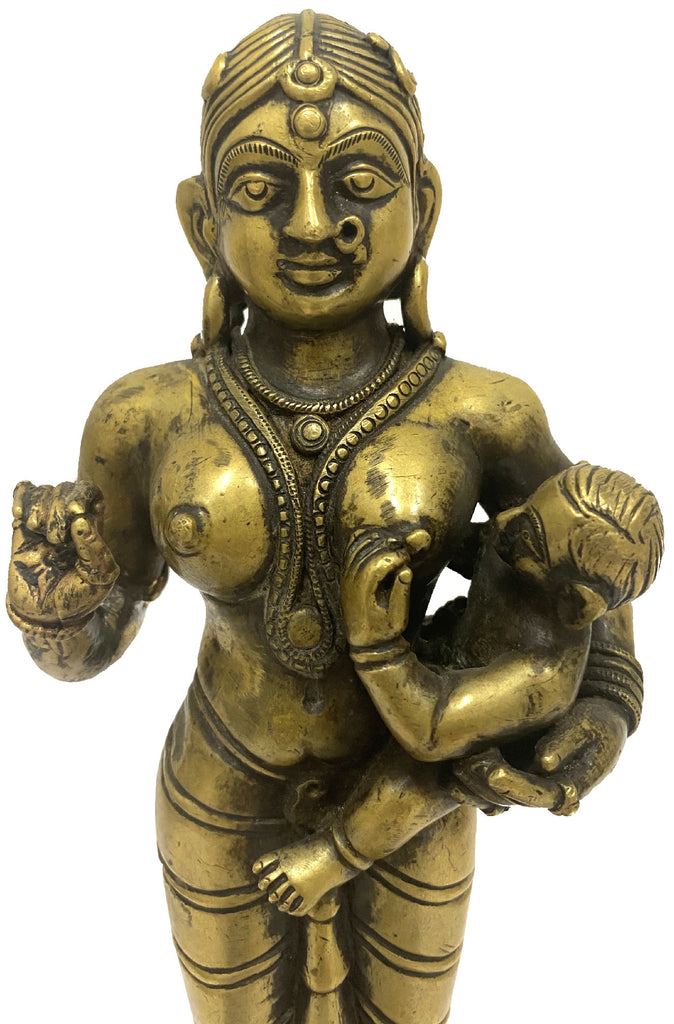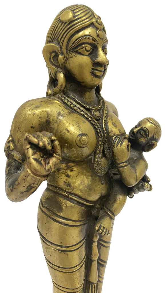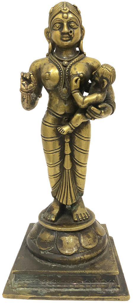 DescriptionRead MoreThis is a spectacular brass, lost-wax cast “Mother and Child” or “Krishna with his mother Yashoda” figure from North Karnataka or Maharashtra. Krishna is the god of compassion, tenderness, and love; and is one of the most popular and widely revered among Indian divinities. In this figure, Yashoda stands on a circular lotus flower pedestal above a square plinth holding the baby Krishna in her arm. Yashoda is decorated with jewellery like necklaces, a nose ring and bracelets produced with fine details. Her hair has been braided and hangs in a long, beautiful plait down her back.