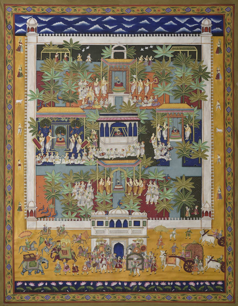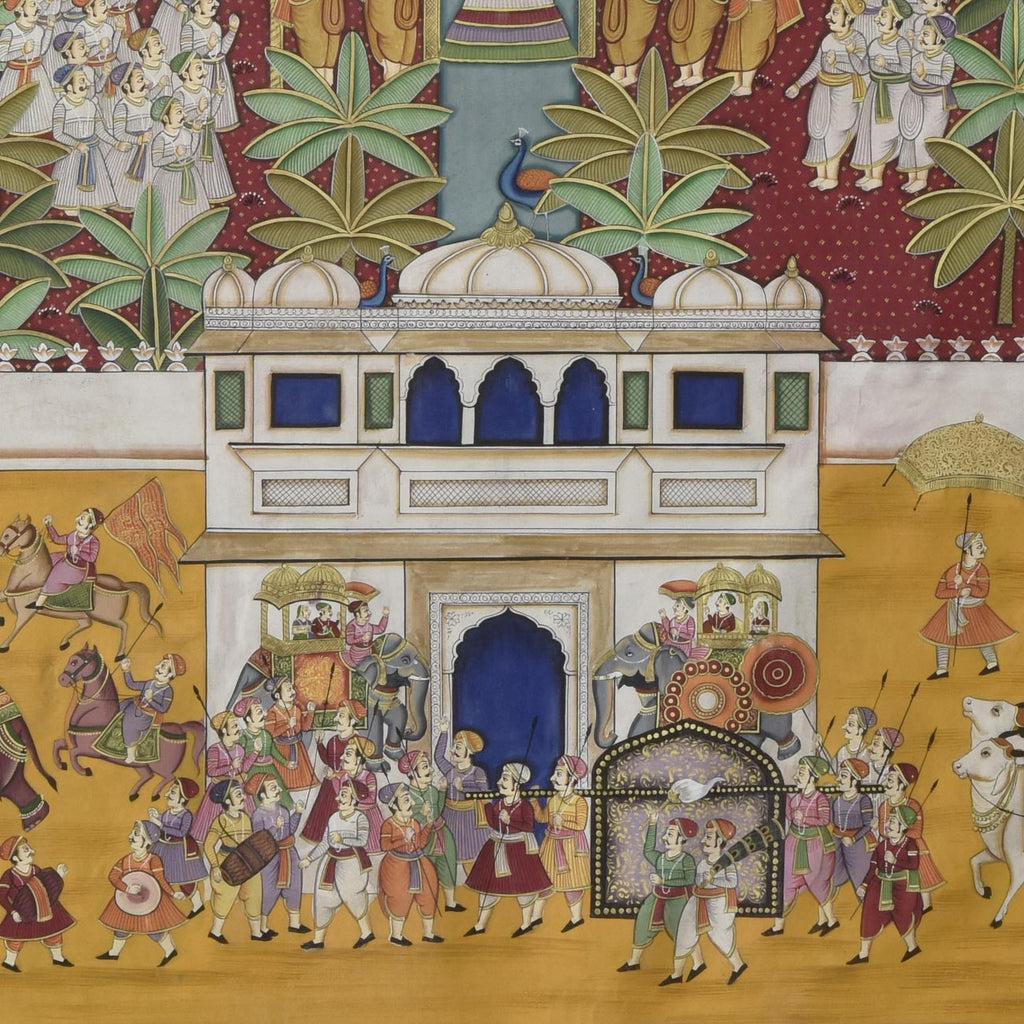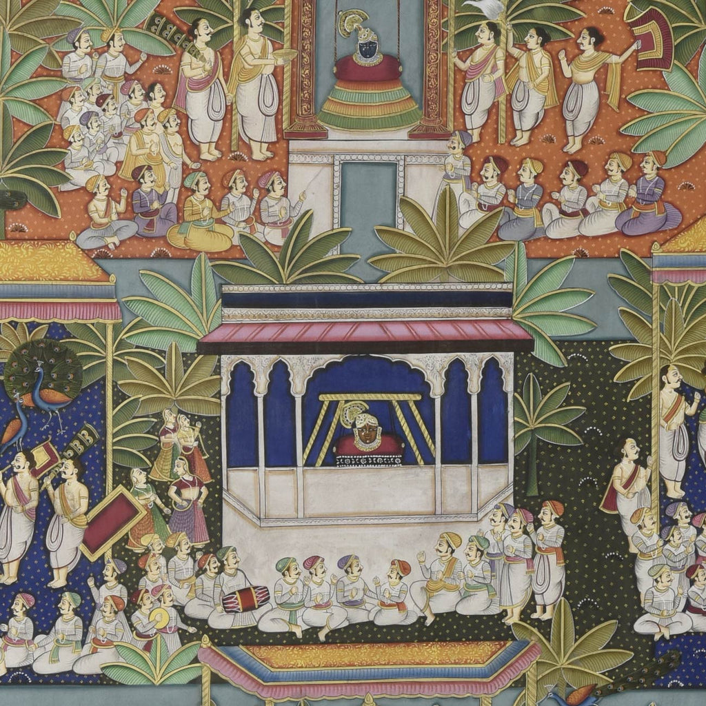 Lal Bagh is a garden in Nathdwara, where all the festivities connected with Laddoo Gopal are celebrated. This exquisite pichwai depicts elaborate scenes from such festivities.