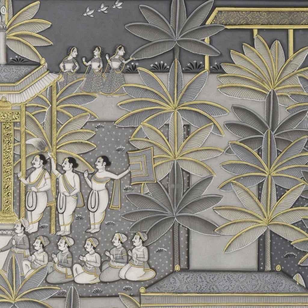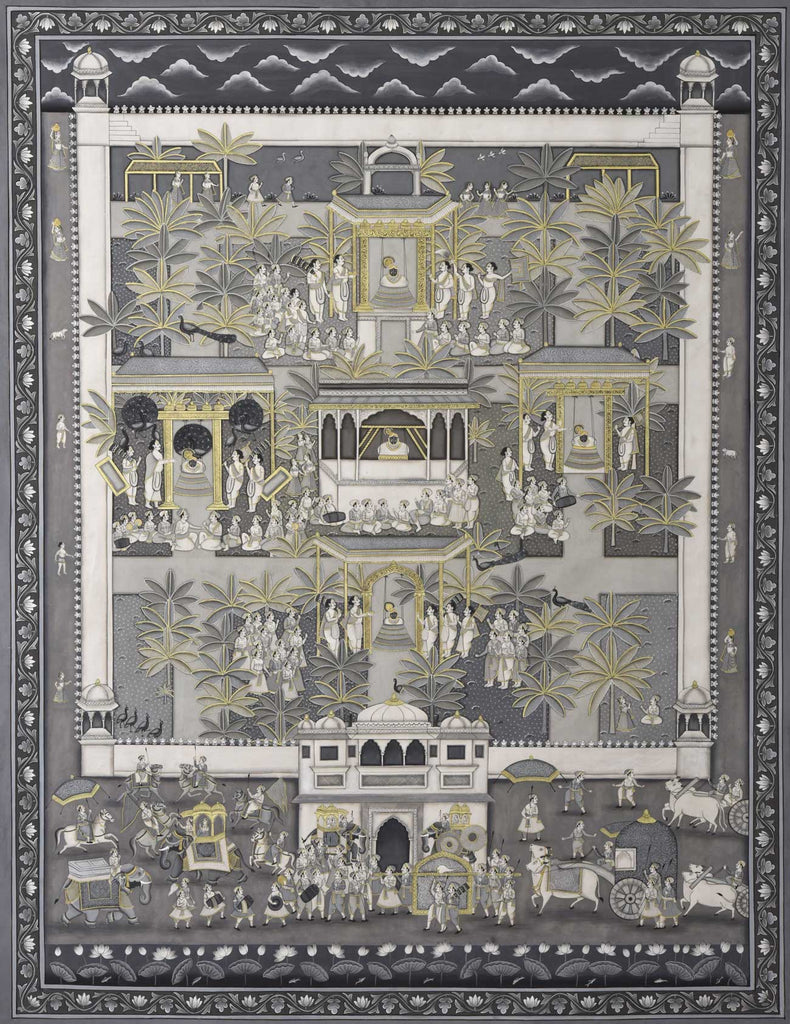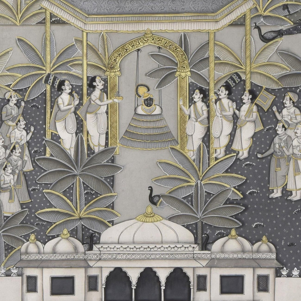 Lal Bagh is a garden in Nathdwara, where all the festivities connected with Laddoo Gopal are celebrated. This exquisite pichwai depicts elaborate scenes from such festivities.