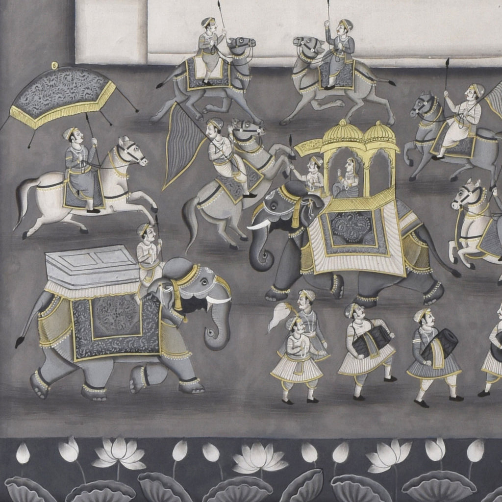 Pichwais are best framed with regular or non-reflective glass. Artworks should be displayed away from direct sunlight and breeze. To clean any accumulated dust, use a soft, dry brush or cloth very lightly on the glass surface or the frame. Make sure there is no moisture on the brush or cloth before cleaning the surface. Once a year, remove the artwork from the wall for a couple of days to let the wall breathe and avoid moisture accumulation. Minor discolouration over the years is normal and to be expected. -