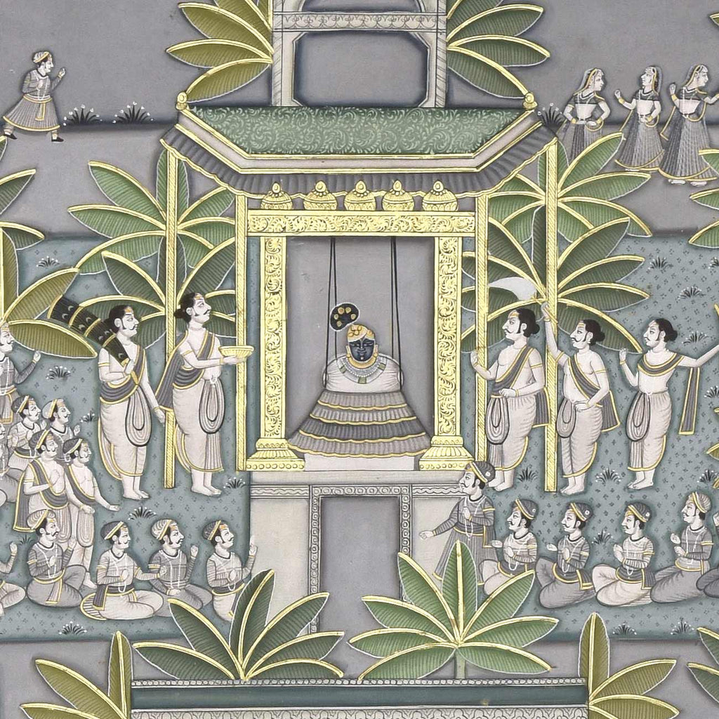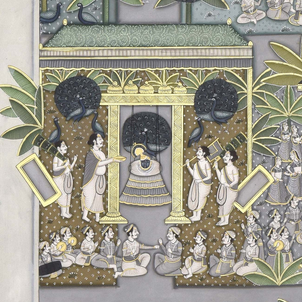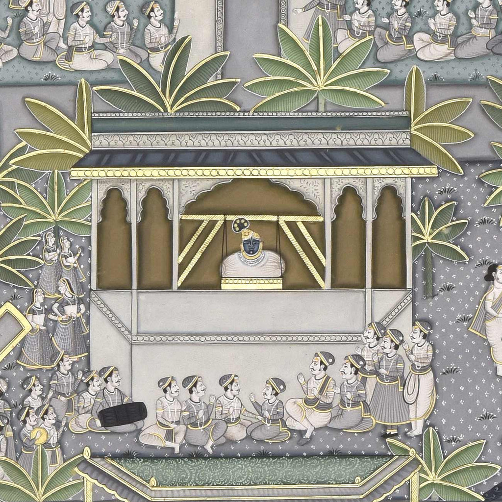 The word Pichwai comes from 'pichh' meaning back, and 'wai', meaning textile hanging. They are made by members of the Pushti Marg sect, founded by Shri Vallabhacharya in the 16th Century. Originally, pichwai paintings were used to decorate the temple of Shrinathji (Shrinathji ki Haveli) in Nathdwara, hung behind the deity to celebrate different seasons, festivals and events in Lord Krishna's life. Over time, pichwais also found a place in the homes of art connoisseurs, owing to their visual appeal. Like several other traditional Indian art forms, the art of Pichwai is also dying, and requires recognition and revival.