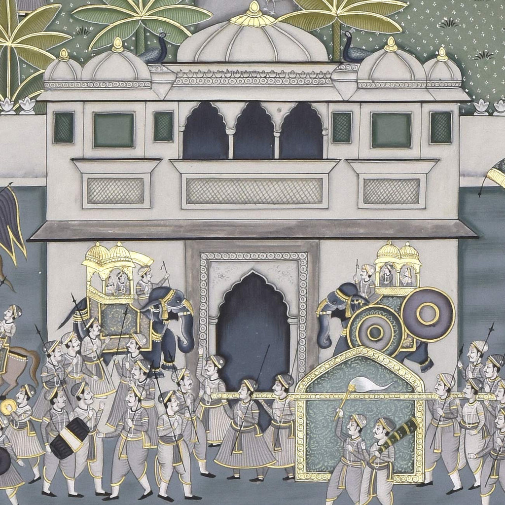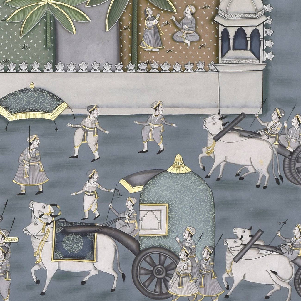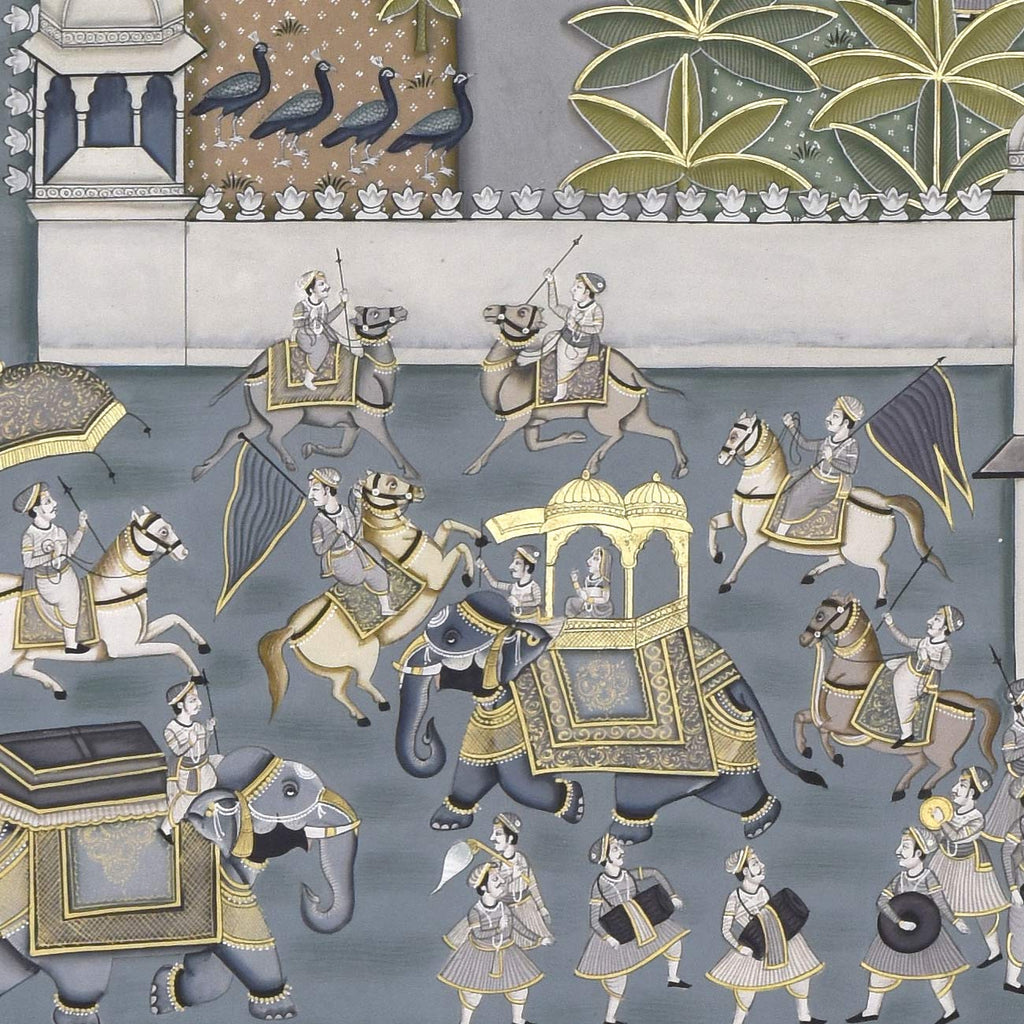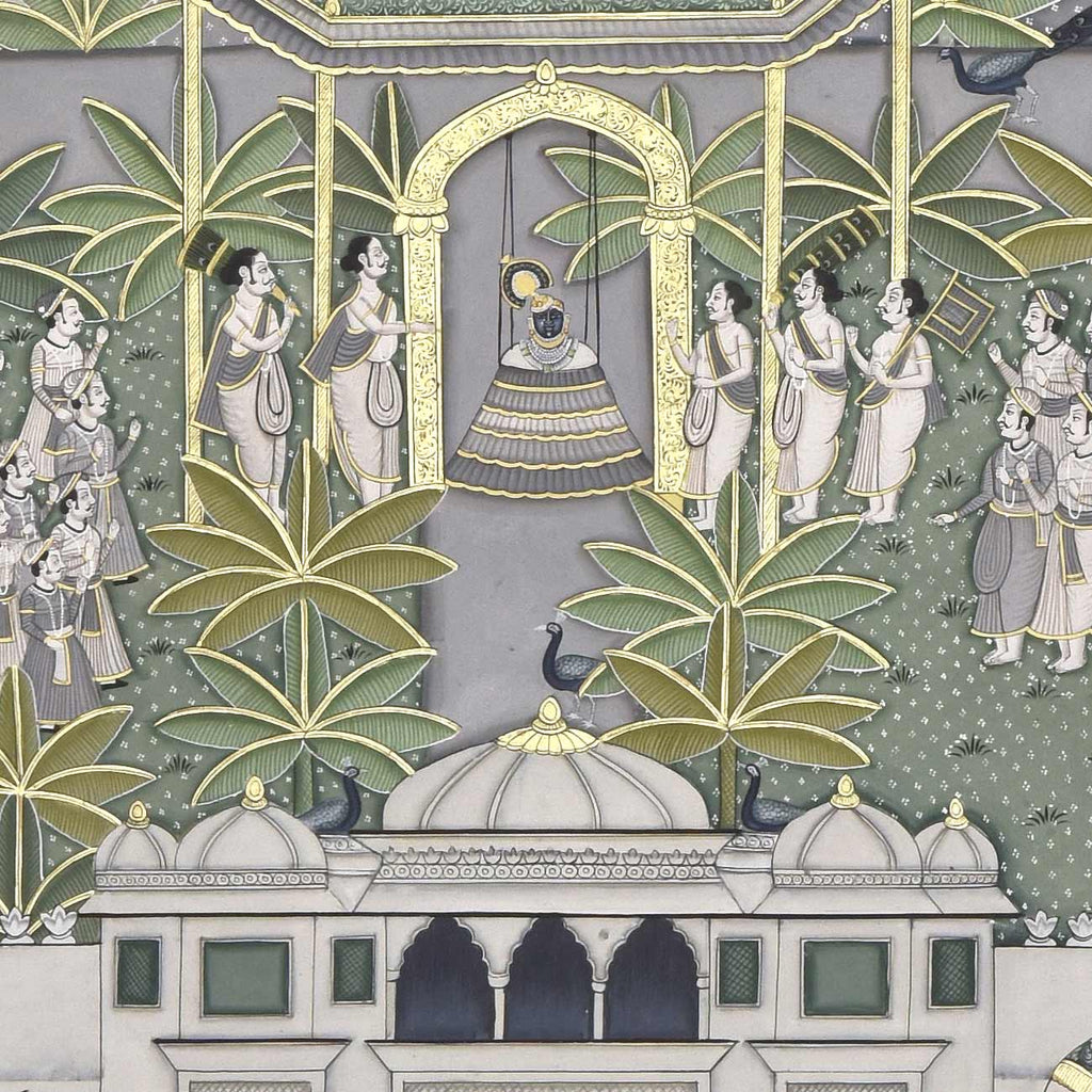 The word Pichwai comes from 'pichh' meaning back, and 'wai', meaning textile hanging. They are made by members of the Pushti Marg sect, founded by Shri Vallabhacharya in the 16th Century. Originally, pichwai paintings were used to decorate the temple of Shrinathji (Shrinathji ki Haveli) in Nathdwara, hung behind the deity to celebrate different seasons, festivals and events in Lord Krishna's life. Over time, pichwais also found a place in the homes of art connoisseurs, owing to their visual appeal. Like several other traditional Indian art forms, the art of Pichwai is also dying, and requires recognition and revival.