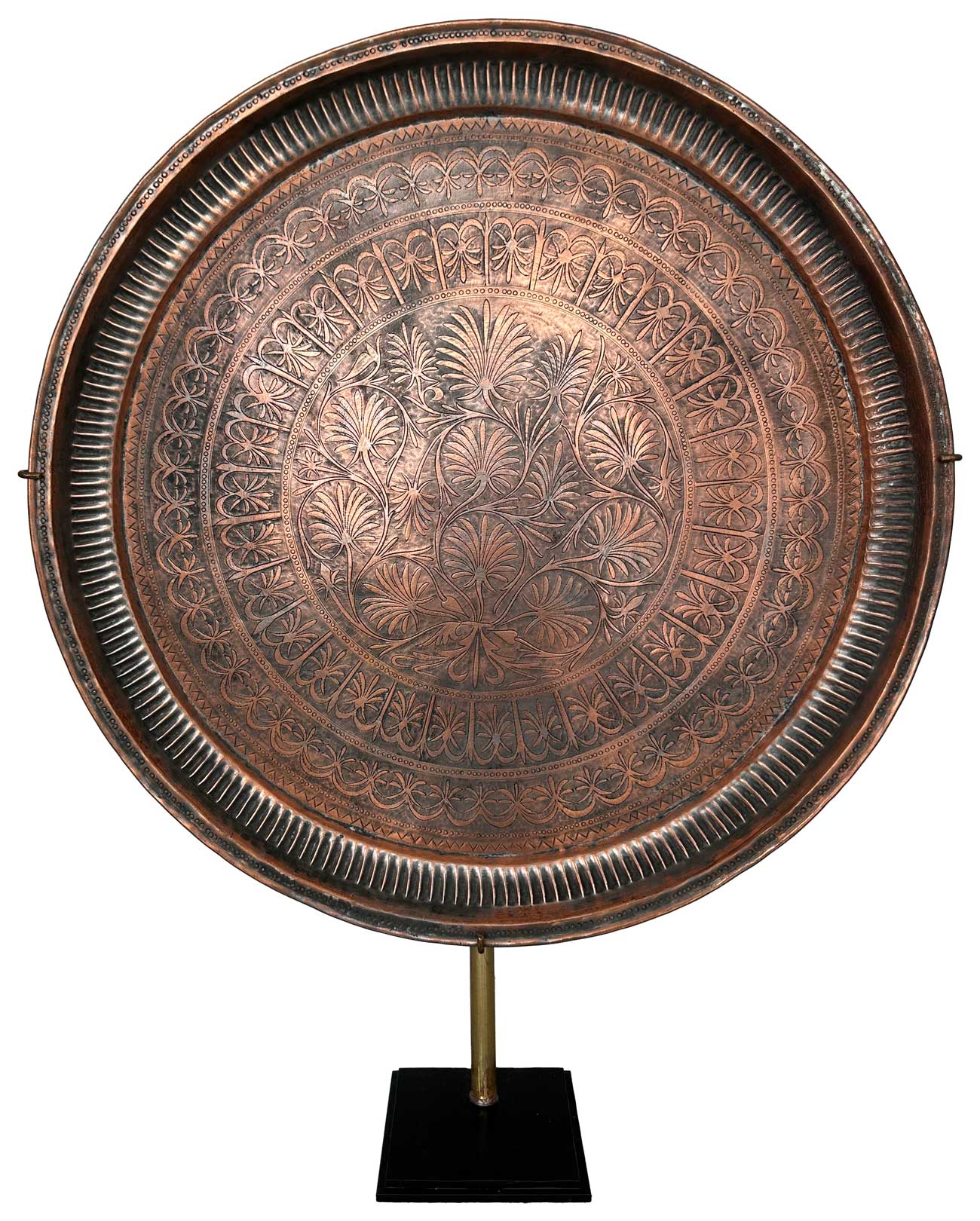 Read MoreLarge tinned copper platter used for serving at feasts, from the Deccan region. The platter features beautiful engraved and repousse work of stylised foliate designs, similar to acanthus leaves.