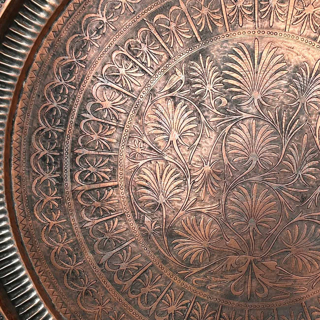 Large tinned copper platter used for serving at feasts, from the Deccan region. The platter features beautiful engraved and repousse work of stylised foliate designs, similar to acanthus leaves.