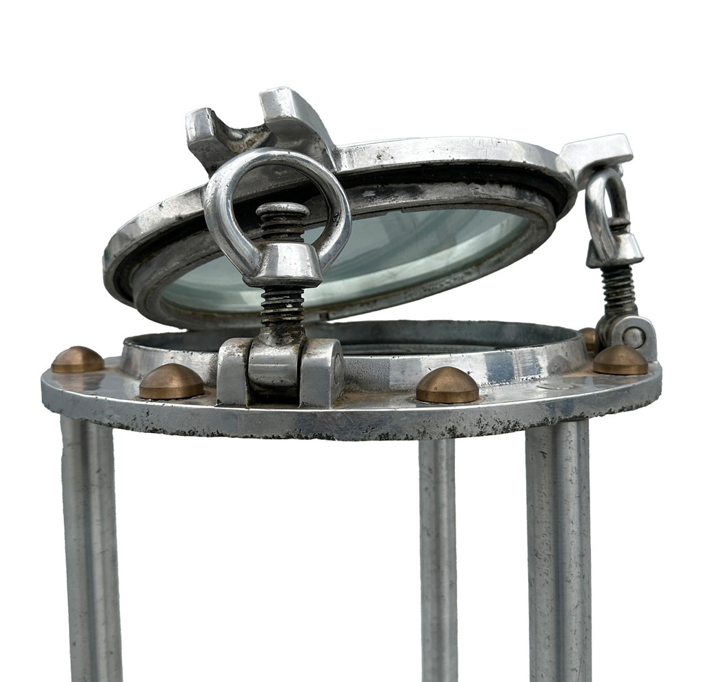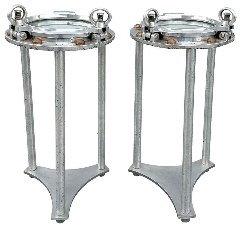 Upcycled vintage ship porthole tables made of aluminium and glass in a Retro style. The portholes were reclaimed from a ship in Bombay and date back to the 1970s. The aluminium stands are handmade to size and make an unusual and innovative new use for these collectible portholes.