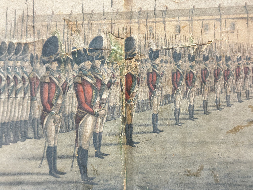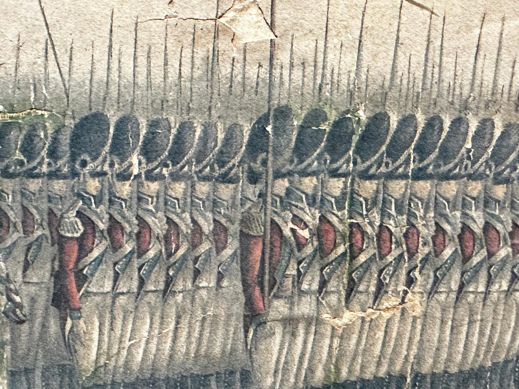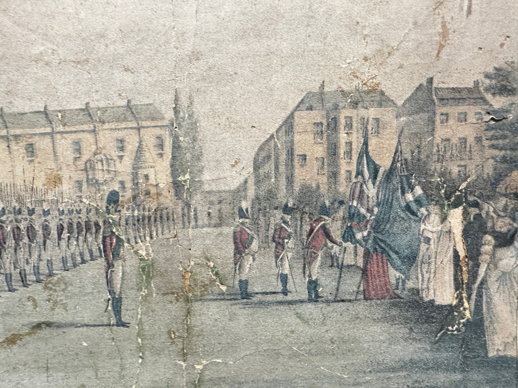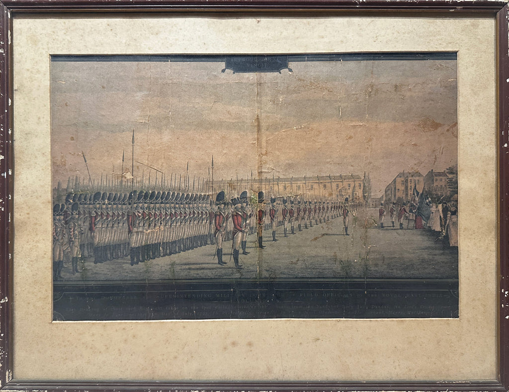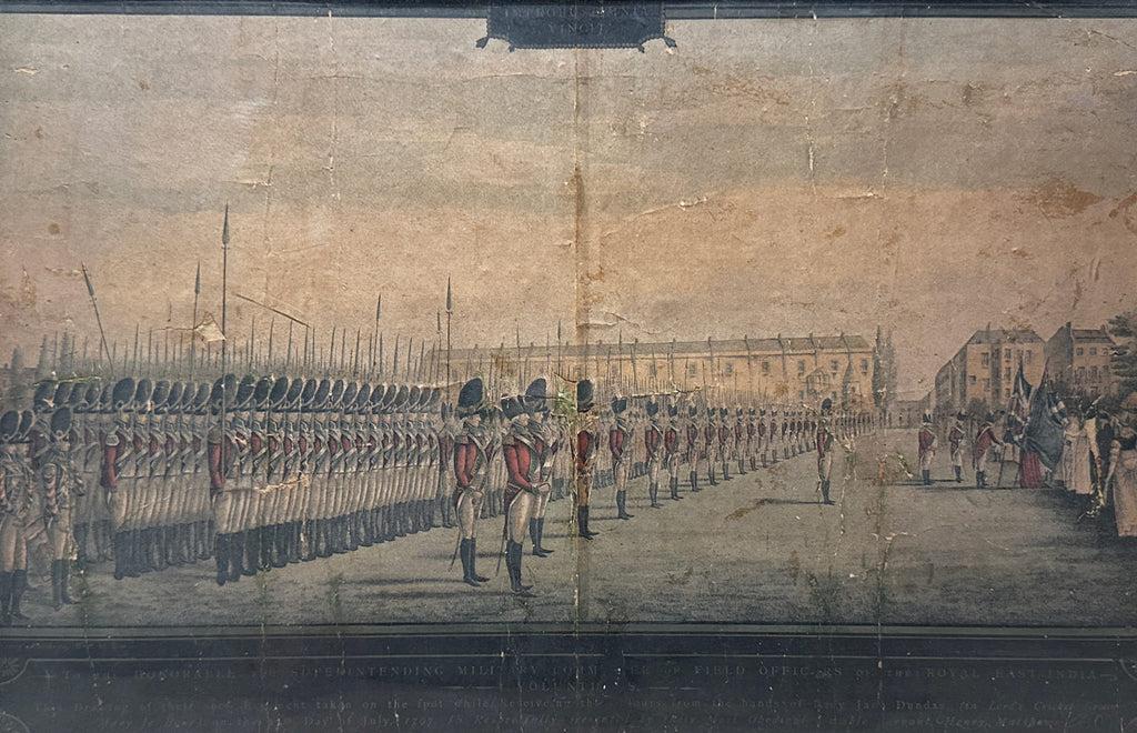 Photo-chromolithograph of the Presentation of Colours to the Second Regiment of Royal East India Volunteers at Lords Cricket Ground London 1797. A fine rare photo-chromolithograph by W. Griggs, after the painting by Henry Mathews from the book “Relics of the Honourable East India Company” by George C. M. Birdwood and William Foster. Published in London, by B. Quaritch, in 1909. The image is entitled along the bottom on a black border with the words “To the Honourable the Superintending Military Committee of Field Officers of the Royal East India - Volunt II - This drawing of their seed regiment taken on the spot while receiving the colours from the hands of Lady Jane Dundas, (in Lords Cricket Ground, Mary le Bone) on the 27th day of July 1797, is Respectfully presented by their Most Obedient Humble Servant Henry Mathews.” At the top centre of the image is the Latin phrase “Labor improbus omnia vincit” which means “Steady work overcomes all”, although the word Labour has been obscured by the mount. The regiment stand in dress uniform on the left and on the right Lady Jane Dundas is presenting two flags. The flags are a set of colours belonging to the Royal East India Volunteers (REIV) formed by the East India Company in London during the French Wars to protect East India House and the Company warehouses ‘against hazard from insurrections and tumults’ and to assist the City government in times of disorder.