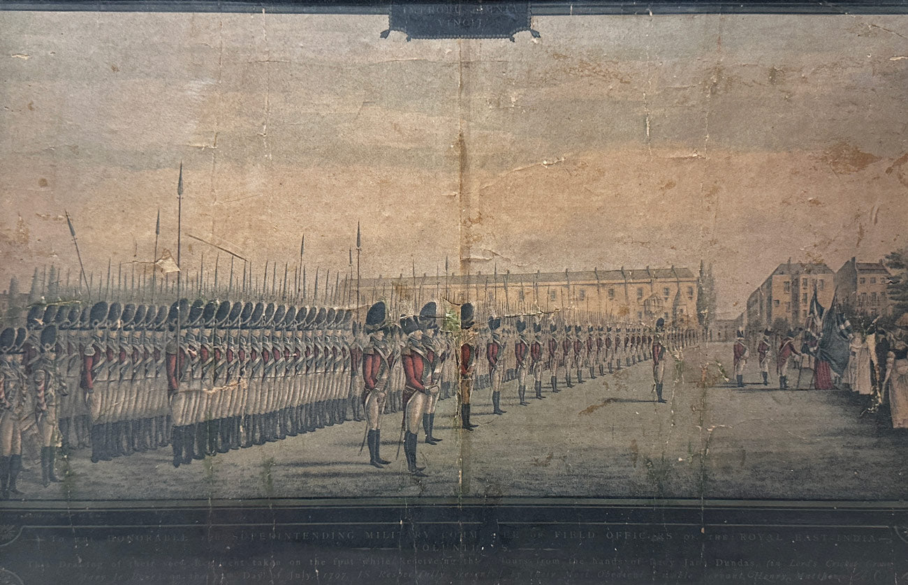 Read MorePhoto-chromolithograph of the Presentation of Colours to the Second Regiment of Royal East India Volunteers at Lords Cricket Ground London 1797. A fine rare photo-chromolithograph by W. Griggs, after the painting by Henry Mathews from the book “Relics of the Honourable East India Company” by George C. M. Birdwood and William Foster. Published in London, by B. Quaritch, in 1909. The image is entitled along the bottom on a black border with the words “To the Honourable the Superintending Military Committee of Field Officers of the Royal East India - Volunt II - This drawing of their seed regiment taken on the spot while receiving the colours from the hands of Lady Jane Dundas, (in Lords Cricket Ground, Mary le Bone) on the 27th day of July 1797, is Respectfully presented by their Most Obedient Humble Servant Henry Mathews.” At the top centre of the image is the Latin phrase “Labor improbus omnia vincit” which means “Steady work overcomes all”, although the word Labour has been obscured by the mount. The regiment stand in dress uniform on the left and on the right Lady Jane Dundas is presenting two flags. The flags are a set of colours belonging to the Royal East India Volunteers (REIV) formed by the East India Company in London during the French Wars to protect East India House and the Company warehouses ‘against hazard from insurrections and tumults’ and to assist the City government in times of disorder.