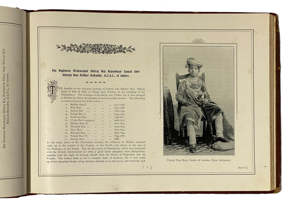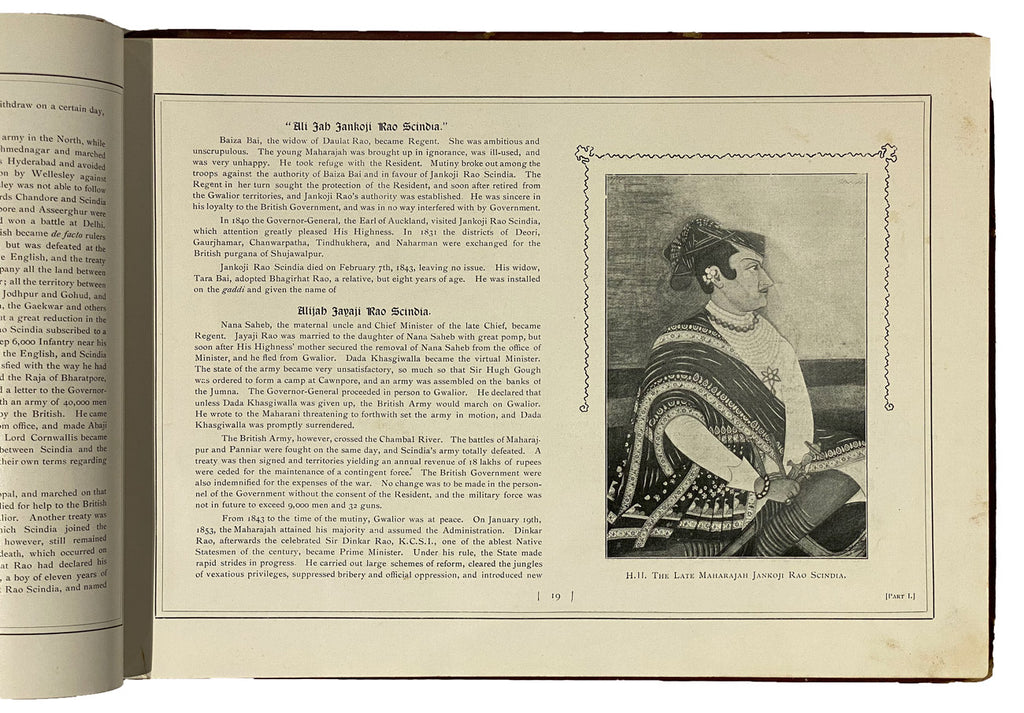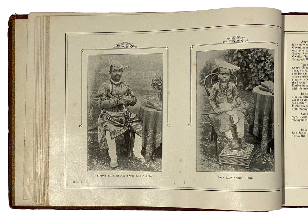 ‘A fascinating photographic record of the British Raj celebrating the "wise rulers and loyal officials" who "stepped in and produced order out of chaos" in colonial India. The text is divided into sections profiling Indian and British officers in the states of Gwalior, Indore, Bhopal, Malwa, Bhopawar, Bundelkhand, and Baghelkhand, with a biography and photographic portrait of each man dressed in finery, sometimes pictured with family members. The author, whose profile is included, was agent to the Governor-General in Central India.’
