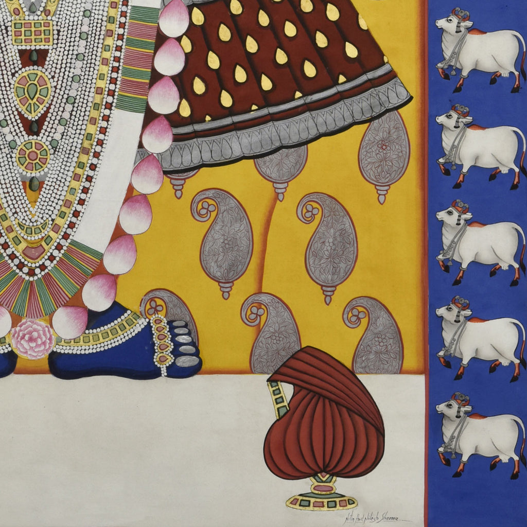 Read MorePichwai (pichvai) is a style of painting that originated over 400 years ago, in the town of Nathdwara near Udaipur in Rajasthan, India. Intricate and visually stunning, pichwai paintings, made on cloth, depict tales from Lord Krishna's life. Creating a pichwai can take several months, and requires immense skill, as the smallest details need to be painted with precision. Lord Krishna is often depicted as Shrinathji in Pichwais, which is the deity manifest as a seven-year-old child. Other common subjects found in pichwai paintings are Radha, gopis, cows and lotuses. Festivals and celebrations such as Sharad Purnima, Raas Leela, Annakoot or Govardhan Puja, Janmashtami, Gopashtami, Nand Mahotsav, Diwali and Holi are frequently depicted in Pichwais.