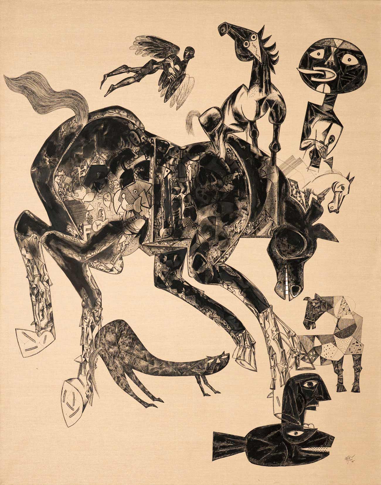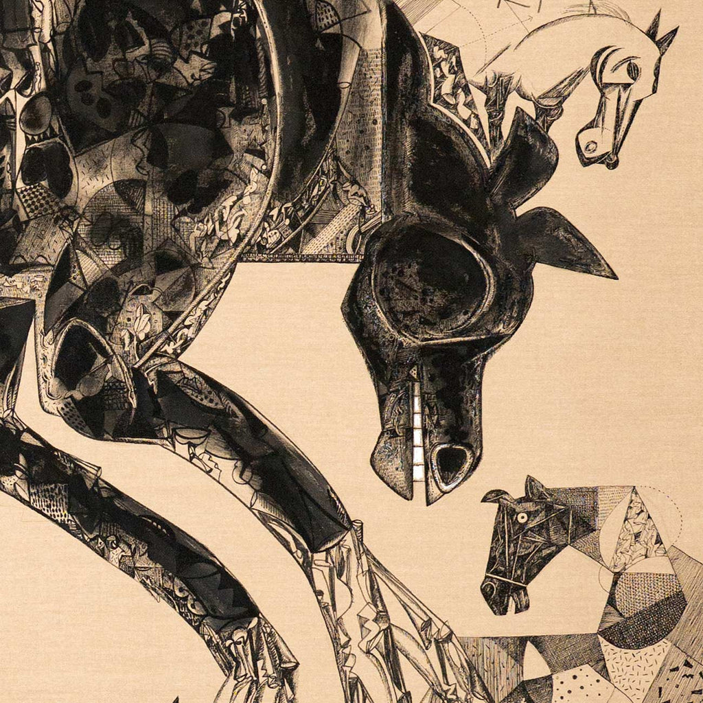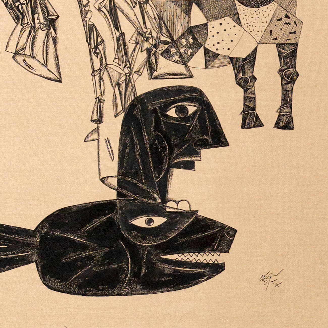 Dominated by bold lines and strokes of the powerful imagery of horses in motion, this work evokes a visceral sense of upheaval and transformation. Laxman Aelay uses the horse as a symbol of freedom and strength. It represents a revolutionary figure, torn between chaos and creation. Above and around the central horse, human-like and animal-like forms appear to observe, flee, or participate in the turmoil. Their distorted anatomy and the surrounding surreal figures suggest a feeling of struggle — a rebellion not just against oppression, but against confinement itself. The horse gallops through the wreckage of the past, carrying with it the promise and peril of revolution, reminding us that every act of liberation comes with both beauty and brutality.