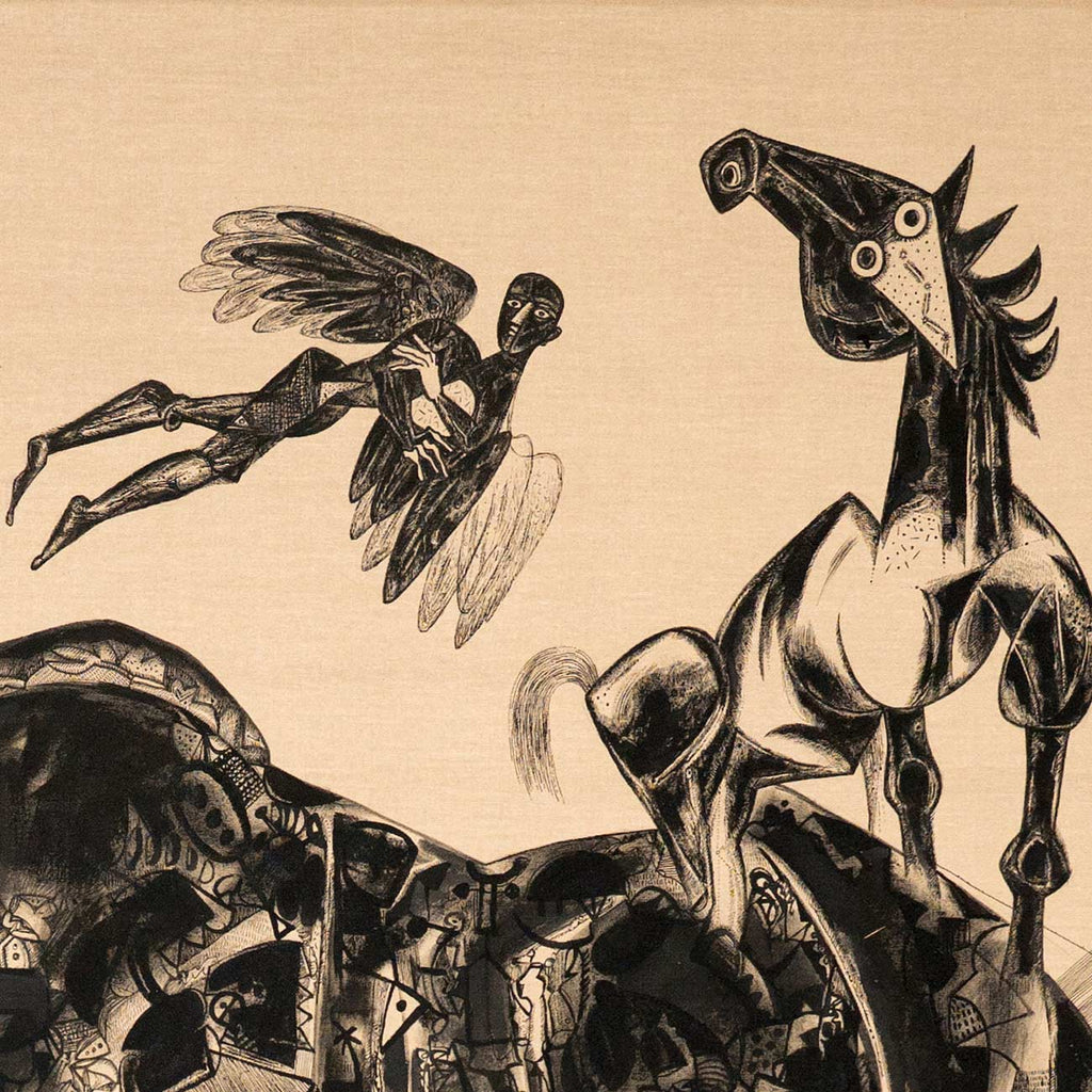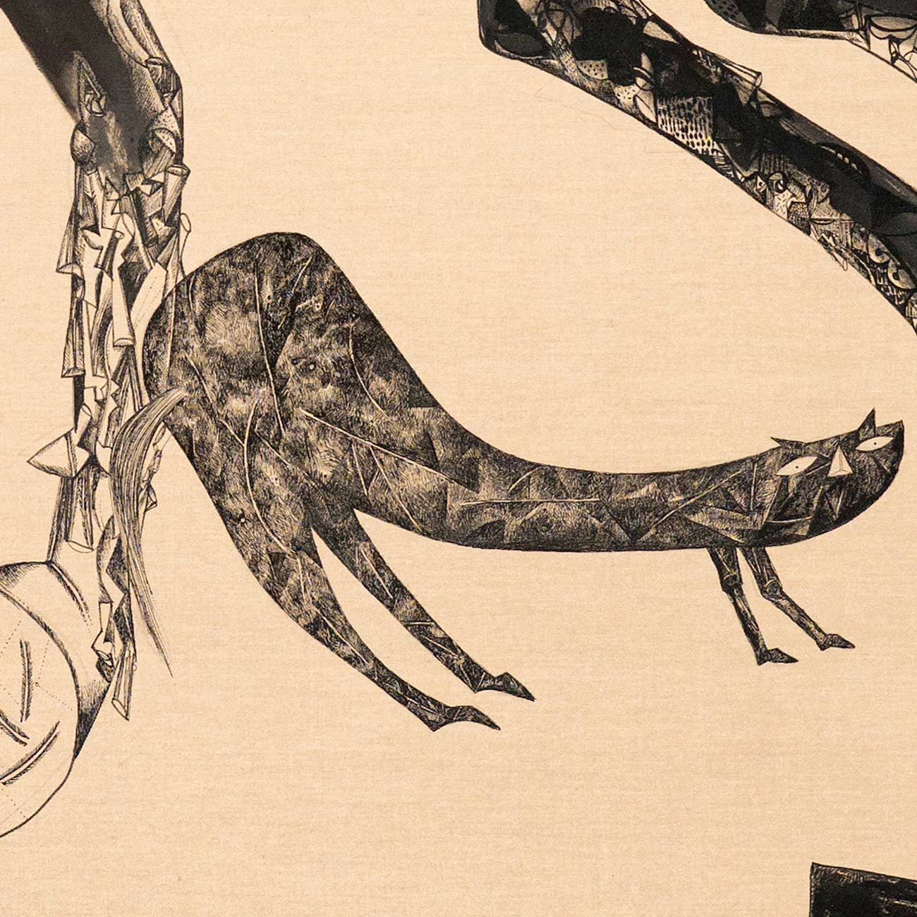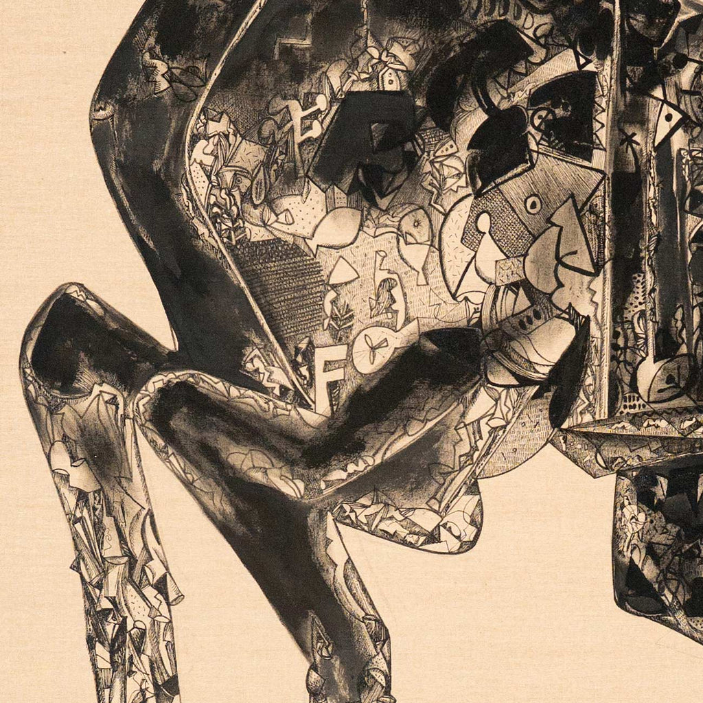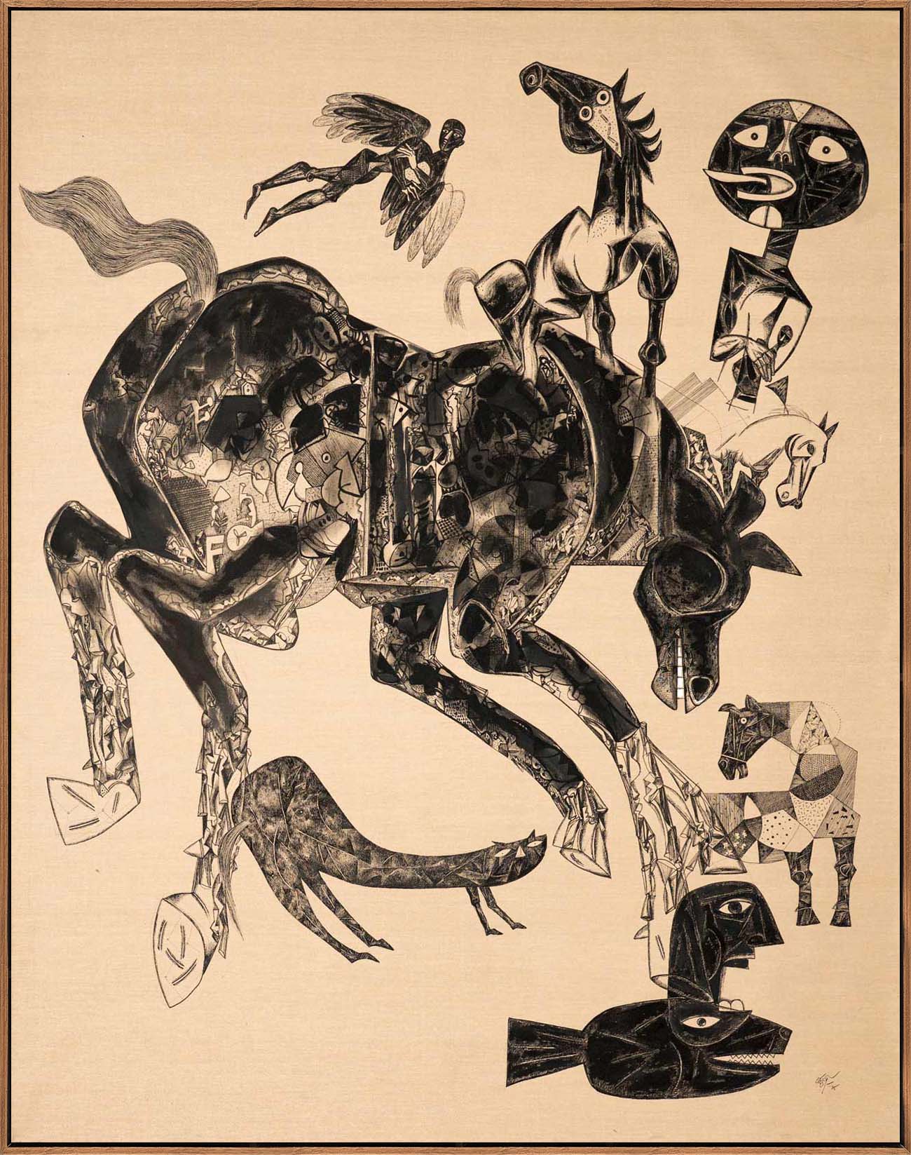 Dominated by bold lines and strokes of the powerful imagery of horses in motion, this work evokes a visceral sense of upheaval and transformation. Laxman Aelay uses the horse as a symbol of freedom and strength. It represents a revolutionary figure, torn between chaos and creation. Above and around the central horse, human-like and animal-like forms appear to observe, flee, or participate in the turmoil. Their distorted anatomy and the surrounding surreal figures suggest a feeling of struggle — a rebellion not just against oppression, but against confinement itself. The horse gallops through the wreckage of the past, carrying with it the promise and peril of revolution, reminding us that every act of liberation comes with both beauty and brutality.