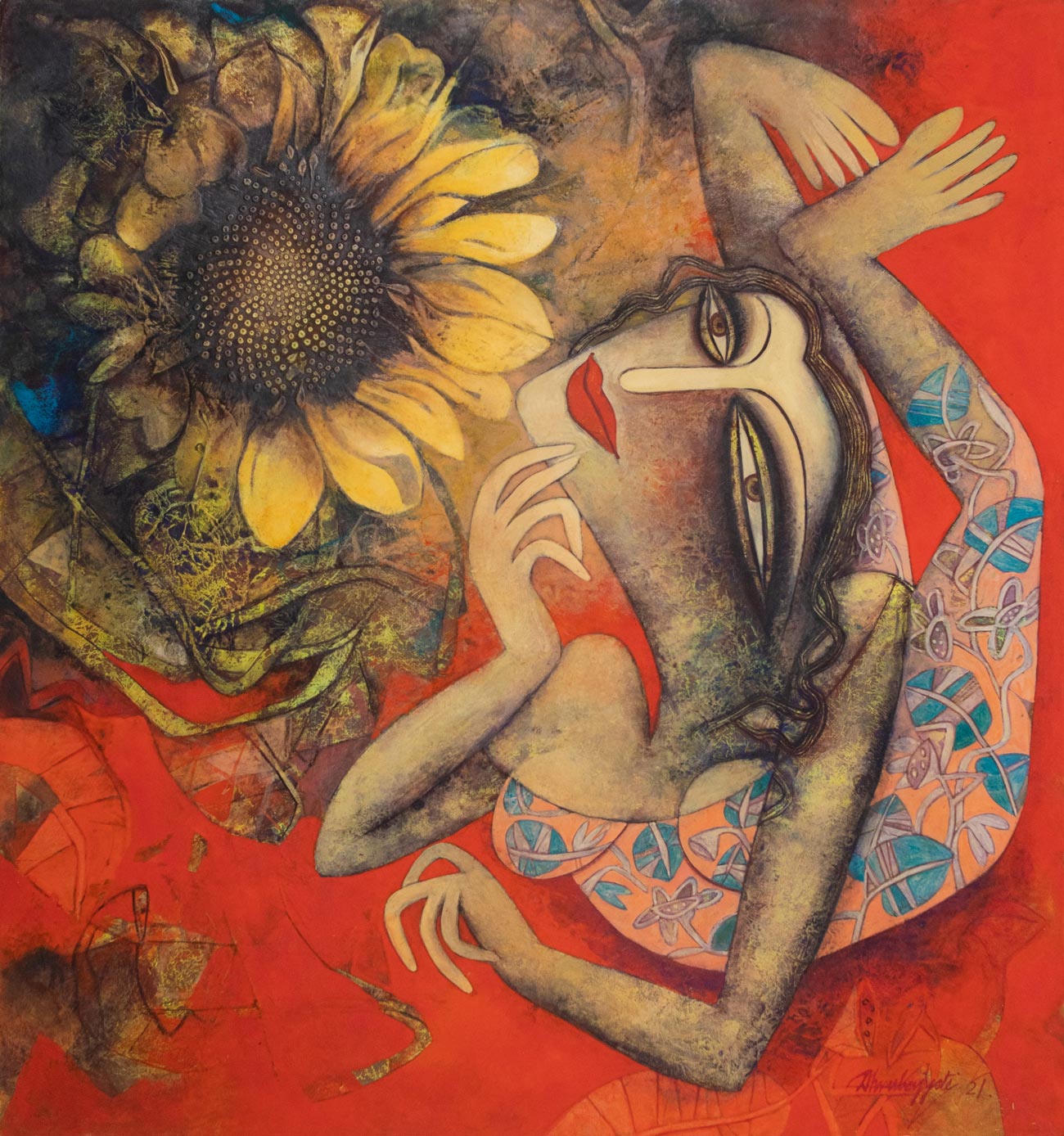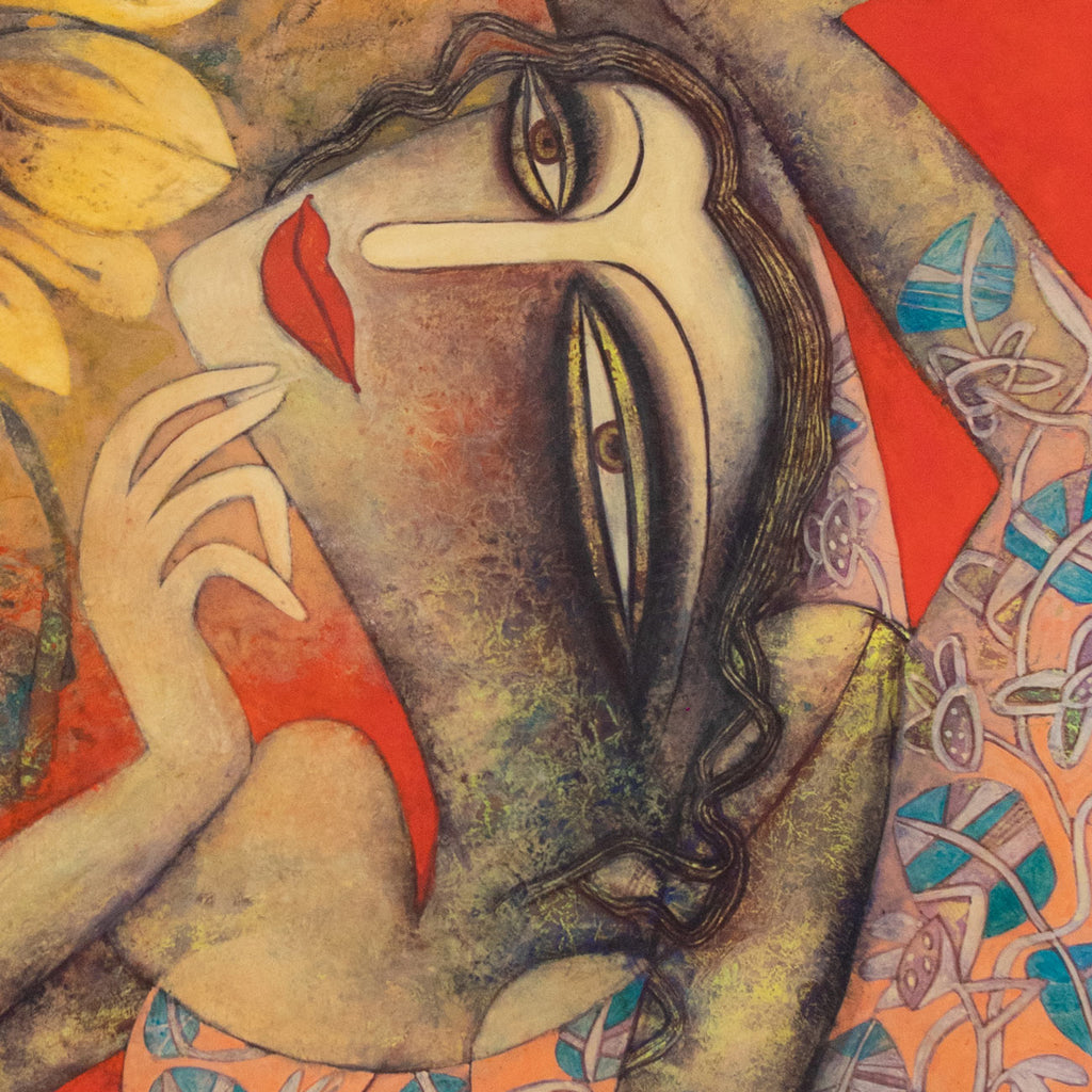 Dhrubajyoti Baral’s playful imagination is depicted through dreamy depictions of young lovers, solitary women, and musicians and bards, surrounded by elements of nature. He works with tempera created out of natural pigments, sourcing indigenous ingredients from Eastern India such as shell powder and shola plant extracts. By meticulously texturing and layering his canvases, Baral creates his trademark dreamy hues bringing vivid reds, lustrous yellows and hazy blues together in harmony. The artist believes every work of art is a world in itself, holding in it the emotions and sensibilities of its creator. Assimilated with his indulgent visions, Baral presents his art as a source of rejuvenation from the banality of everyday life.
