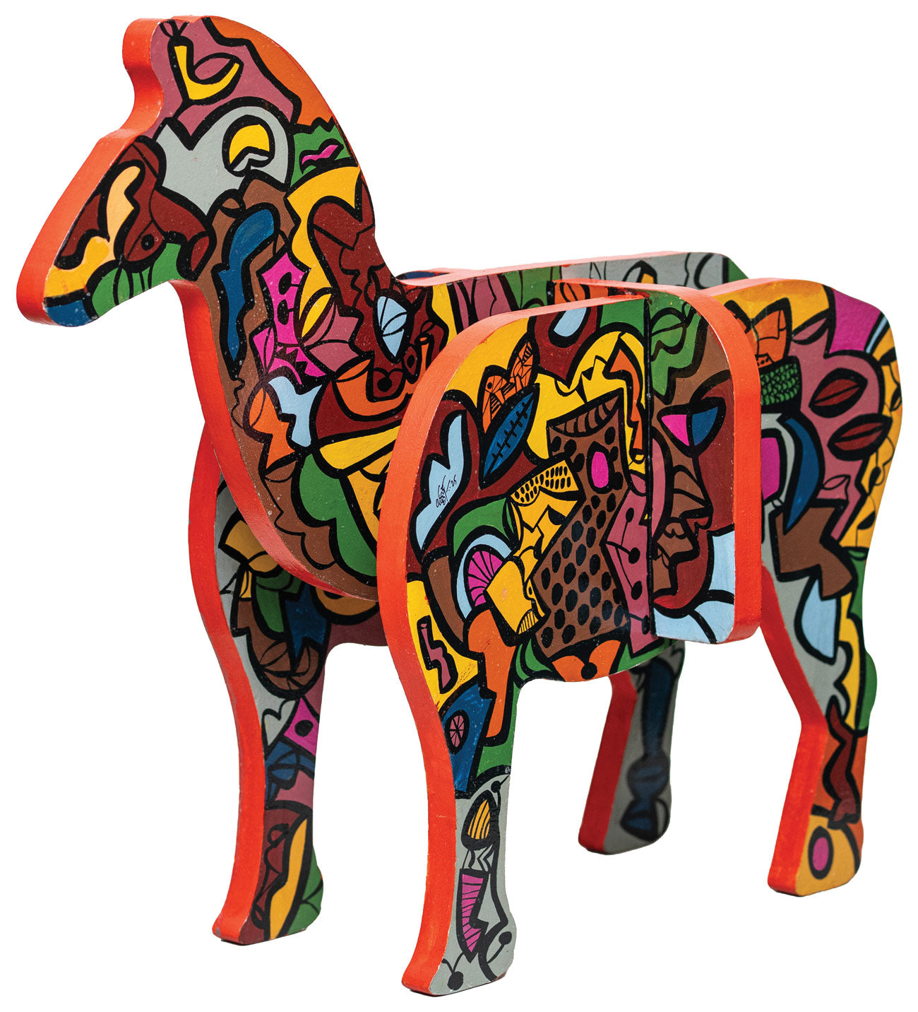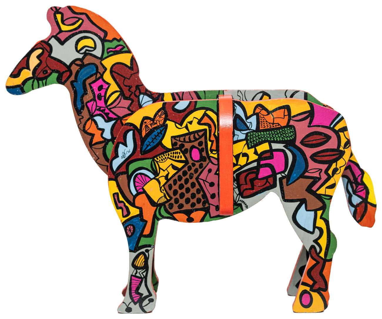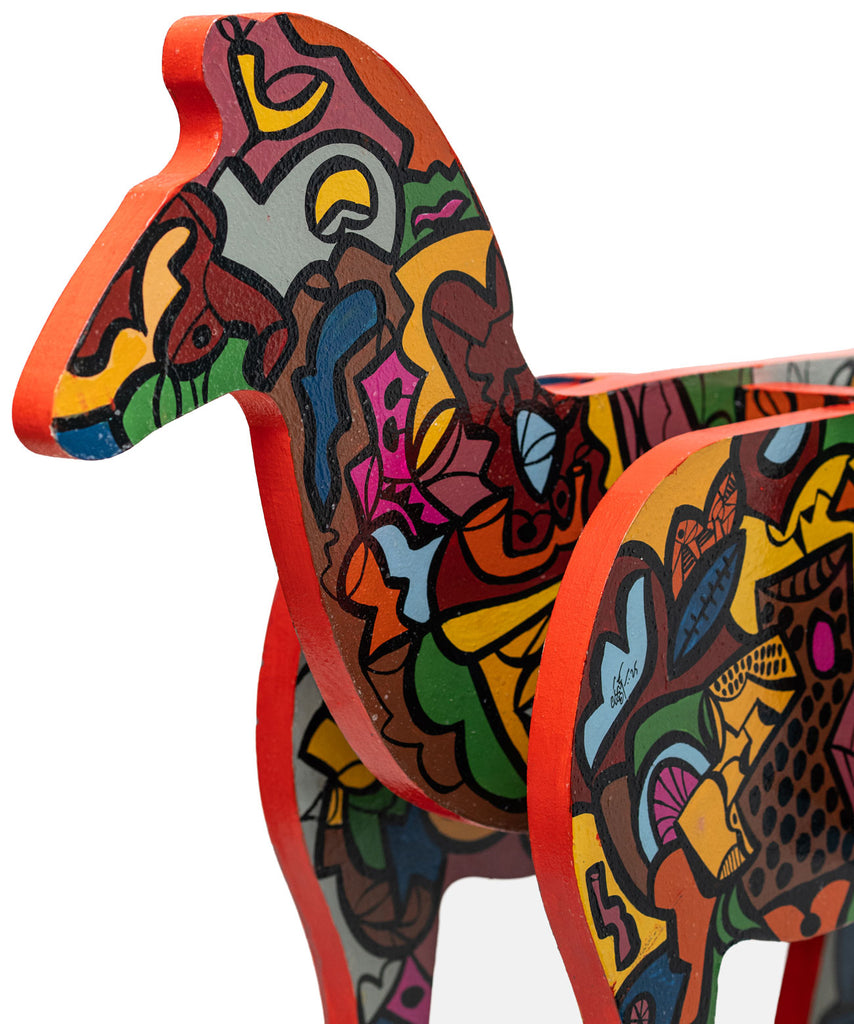 Read MoreThis sculpture is part of a series titled 'Domesticated Animilia'. The sculptural installations are derived from models of children’s toys, where the striking colours and sturdy lines imitate the world of toddlers with joyful expressions, while replicating the wilderness of childhood experiences. The creations bring forth a hidden side of Laxman Aelay — his role as a playful grandfather to his three grandsons, translating his emotions through these domesticated wild beasts in toy-like forms.