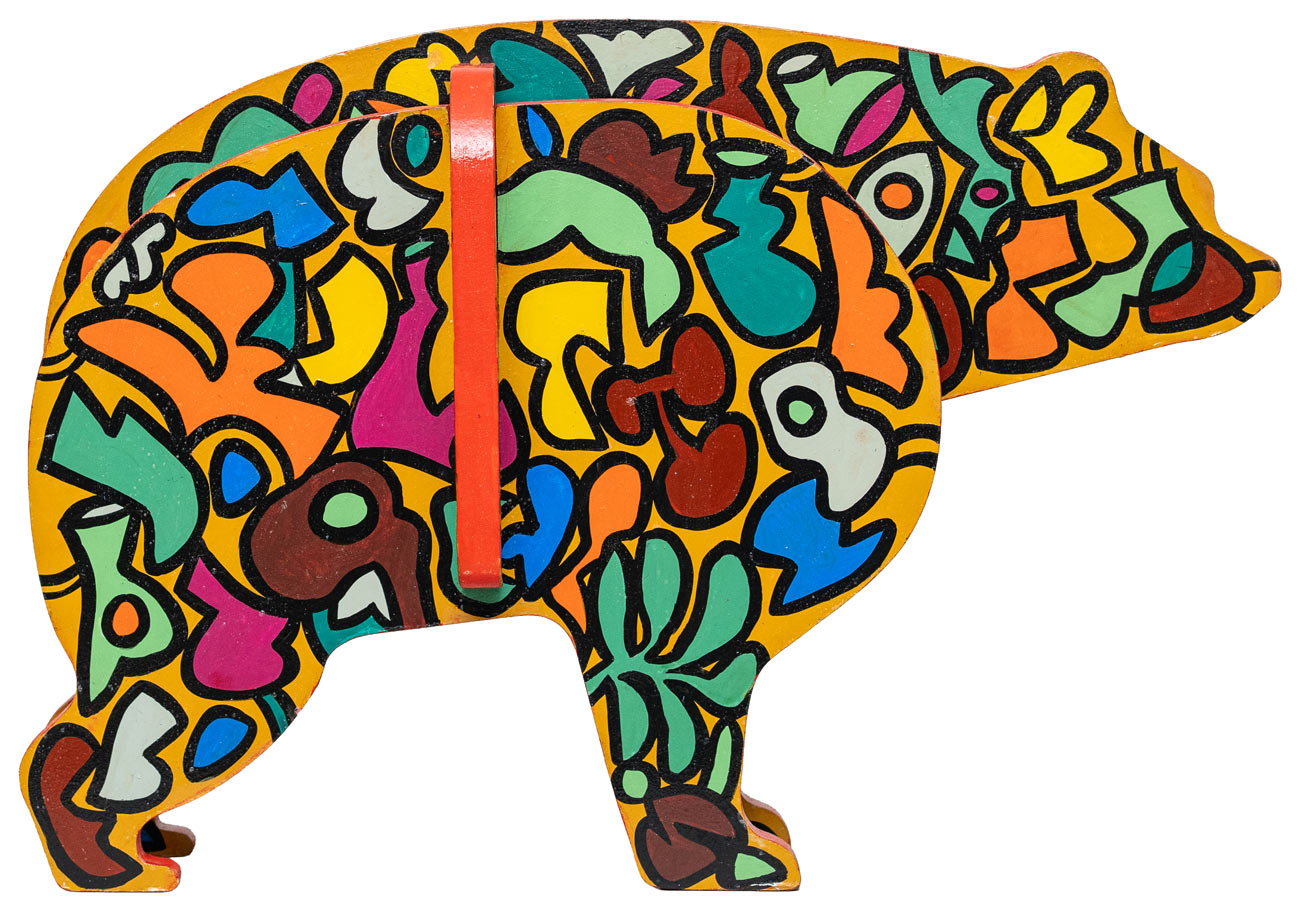 This sculpture is part of a series titled 'Domesticated Animilia'. The sculptural installations are derived from models of children’s toys, where the striking colours and sturdy lines imitate the world of toddlers with joyful expressions, while replicating the wilderness of childhood experiences. The creations bring forth a hidden side of Laxman Aelay — his role as a playful grandfather to his three grandsons, translating his emotions through these domesticated wild beasts in toy-like forms.