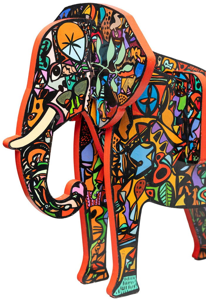 This sculpture is part of a series titled 'Domesticated Animilia'. The sculptural installations are derived from models of children’s toys, where the striking colours and sturdy lines imitate the world of toddlers with joyful expressions, while replicating the wilderness of childhood experiences. The creations bring forth a hidden side of Laxman Aelay — his role as a playful grandfather to his three grandsons, translating his emotions through these domesticated wild beasts in toy-like forms.