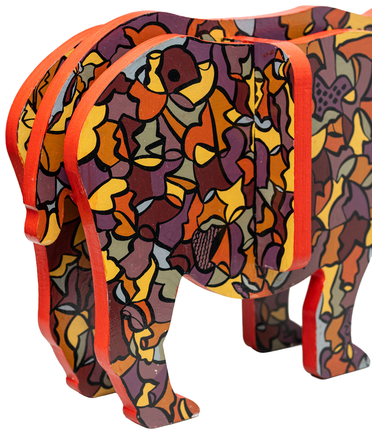 Read MoreThis sculpture is part of a series titled 'Domesticated Animilia'. The sculptural installations are derived from models of children’s toys, where the striking colours and sturdy lines imitate the world of toddlers with joyful expressions, while replicating the wilderness of childhood experiences. The creations bring forth a hidden side of Laxman Aelay — his role as a playful grandfather to his three grandsons, translating his emotions through these domesticated wild beasts in toy-like forms.