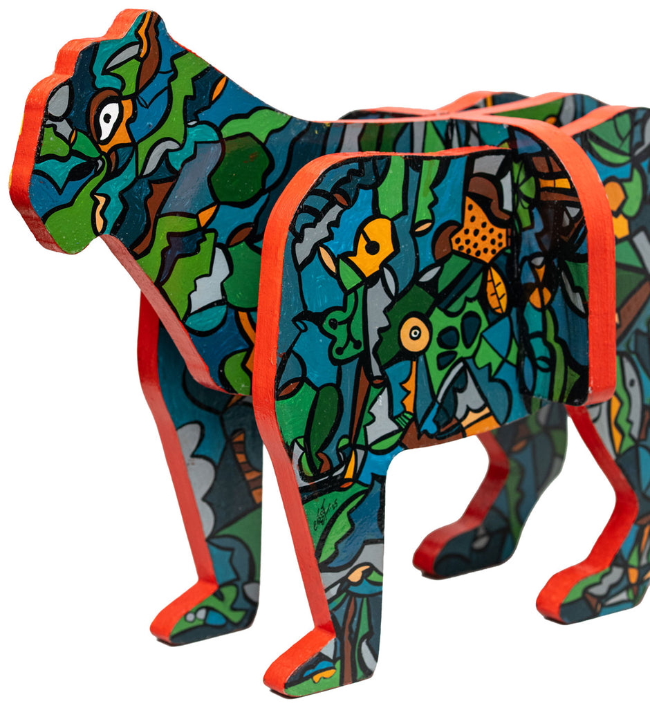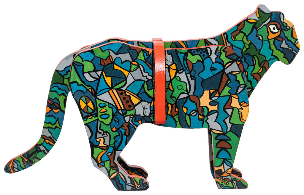 Read MoreThis sculpture is part of a series titled 'Domesticated Animilia'. The sculptural installations are derived from models of children’s toys, where the striking colours and sturdy lines imitate the world of toddlers with joyful expressions, while replicating the wilderness of childhood experiences. The creations bring forth a hidden side of Laxman Aelay — his role as a playful grandfather to his three grandsons, translating his emotions through these domesticated wild beasts in toy-like forms.