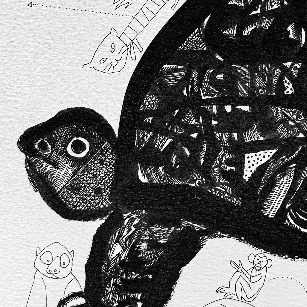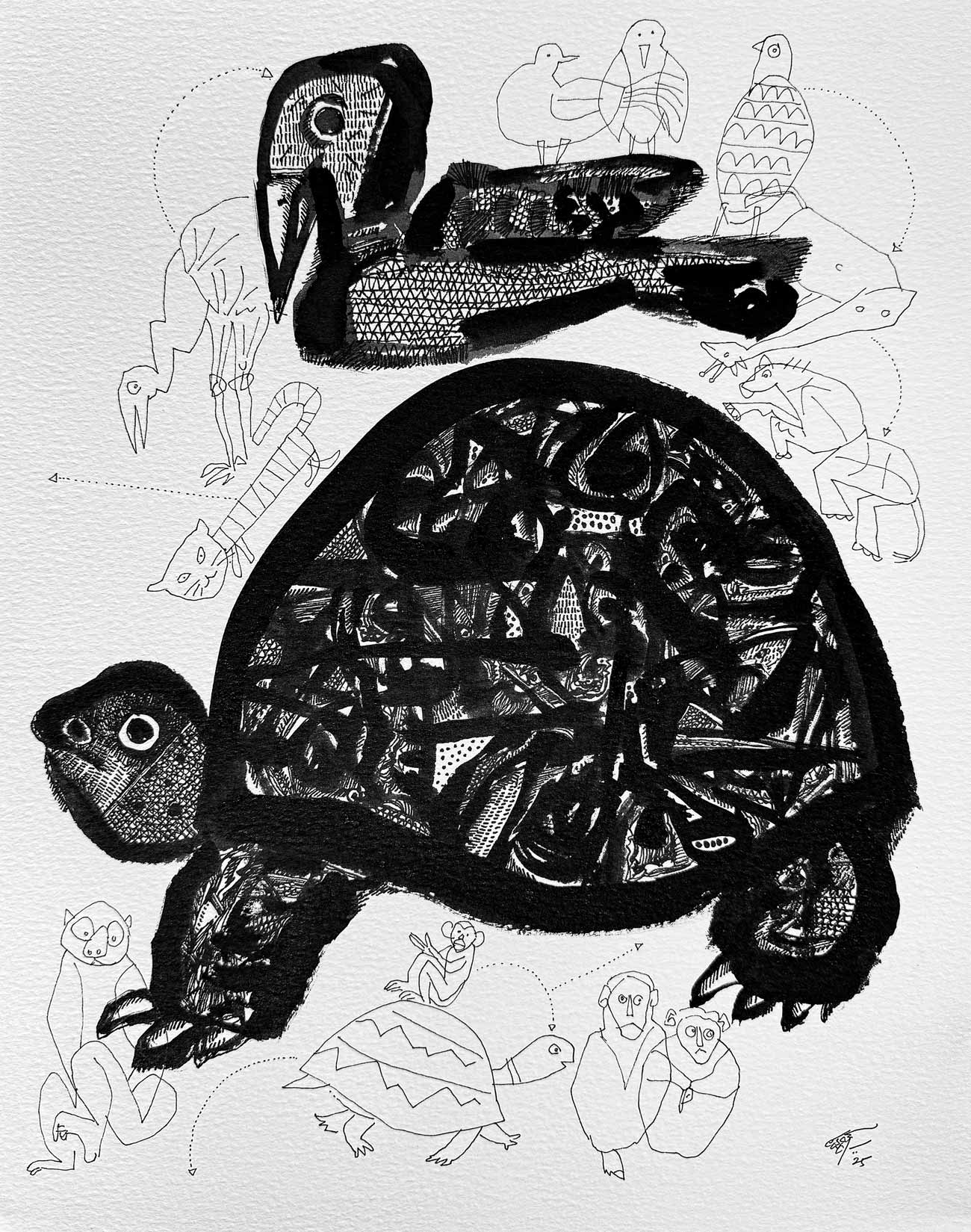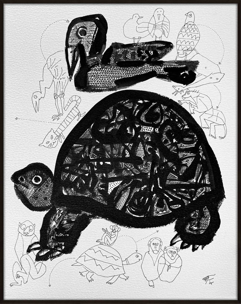 This artwork is part of a series called 'Inked Reflections'. The drawings in this series are a continuation of the explorations that Laxman Aelay began during the solitude of the pandemic, but now shaped by reflection, empathy, and quiet power. The pen and ink works reveal a world where animals become symbols of resilience, companionship, and