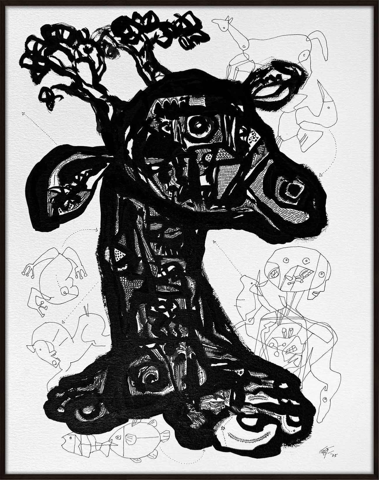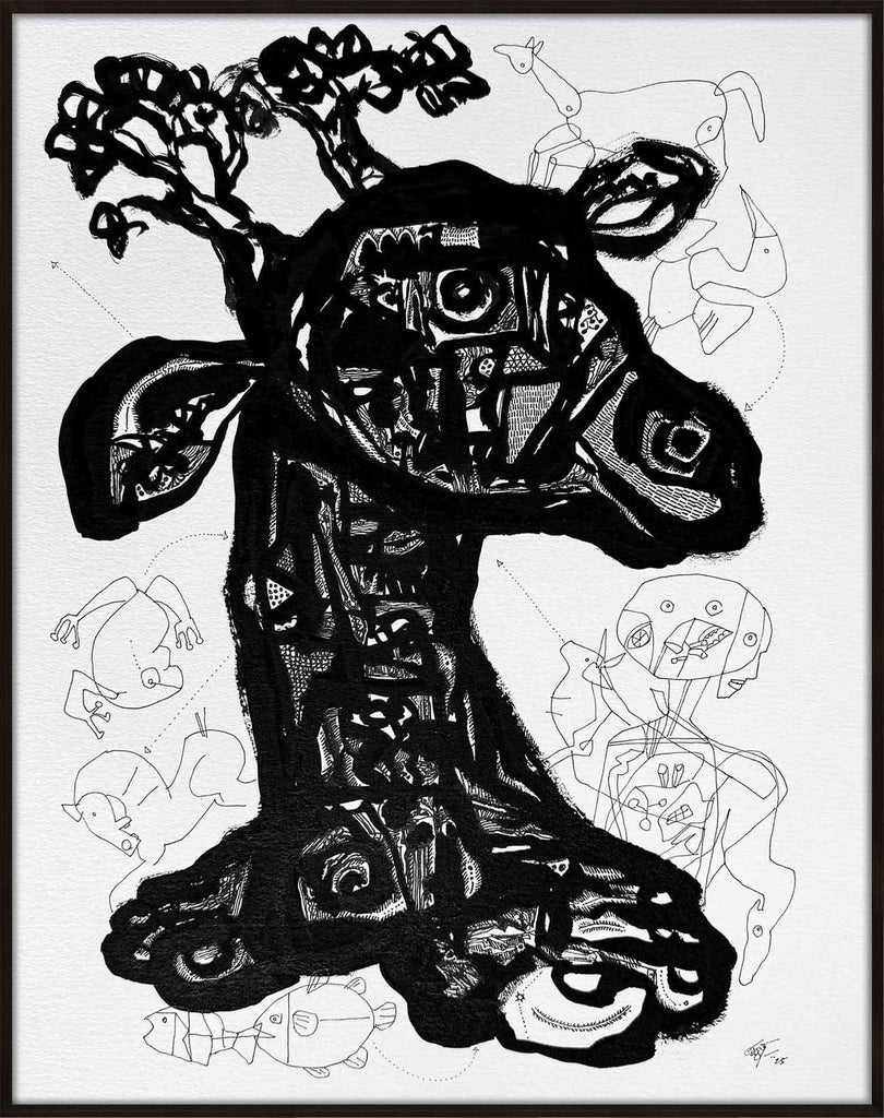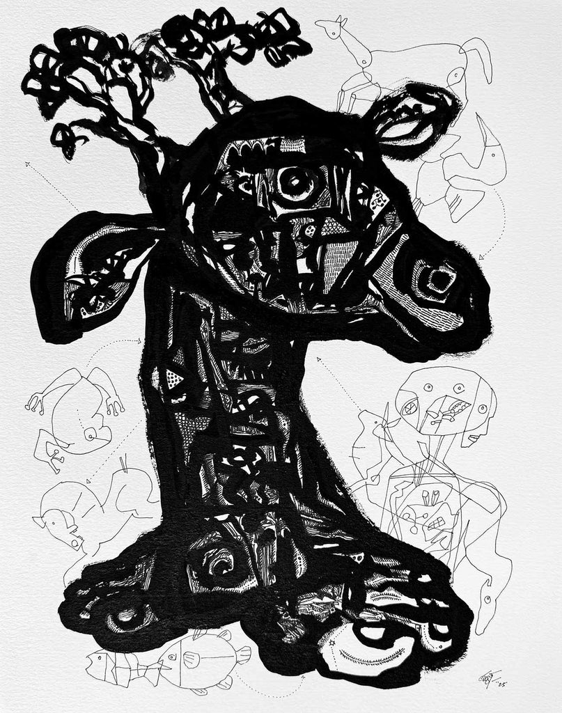 This artwork is part of a series called 'Inked Reflections'. The drawings in this series are a continuation of the explorations that Laxman Aelay began during the solitude of the pandemic, but now shaped by reflection, empathy, and quiet power. The pen and ink works reveal a world where animals become symbols of resilience, companionship, and