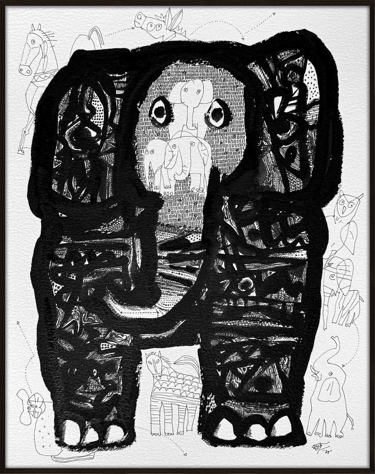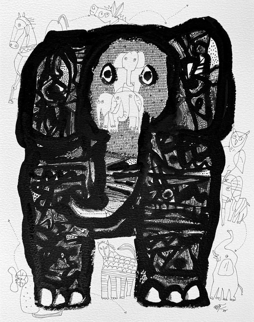 This artwork is part of a series called 'Inked Reflections'. The drawings in this series are a continuation of the explorations that Laxman Aelay began during the solitude of the pandemic, but now shaped by reflection, empathy, and quiet power. The pen and ink works reveal a world where animals become symbols of resilience, companionship, and