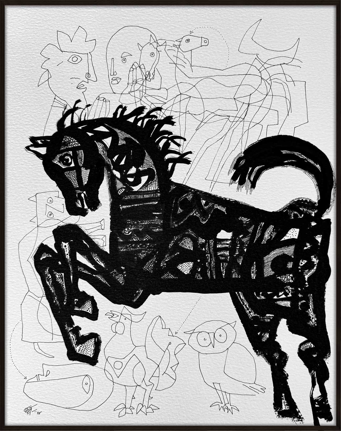 This artwork is part of a series called 'Inked Reflections'. The drawings in this series are a continuation of the explorations that Laxman Aelay began during the solitude of the pandemic, but now shaped by reflection, empathy, and quiet power. The pen and ink works reveal a world where animals become symbols of resilience, companionship, and