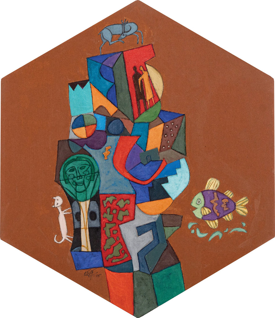 Read MoreThis artwork is part of a series titled 'The Eight Myths'. The hexagonal paintings in this series are rendered with a unique amalgam of local myths and fairy tales infused with fear and fun, that have been shared in rural areas since ages. To render the riddled narratives, Laxman Aelay has used folk and tribal art motifs and contours, by improvising and enhancing the imagery that he often sketches during leisure. What comes out of the paintings is the artistic freedom and simplified symbolism of complex oral narratives.
