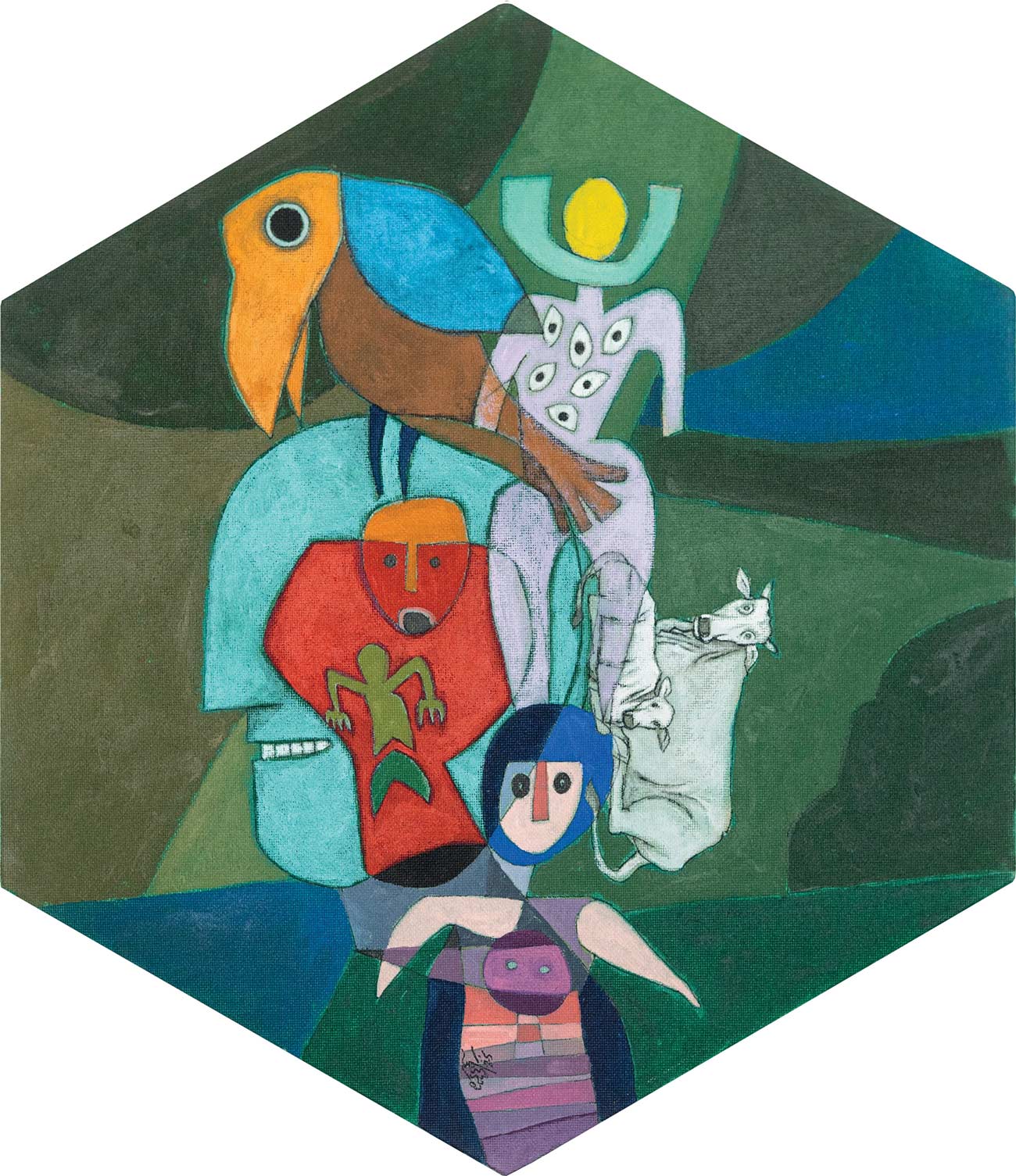 This artwork is part of a series titled 'The Eight Myths'. The hexagonal paintings in this series are rendered with a unique amalgam of local myths and fairy tales infused with fear and fun, that have been shared in rural areas since ages. To render the riddled narratives, Laxman Aelay has used folk and tribal art motifs and contours, by improvising and enhancing the imagery that he often sketches during leisure. What comes out of the paintings is the artistic freedom and simplified symbolism of complex oral narratives.