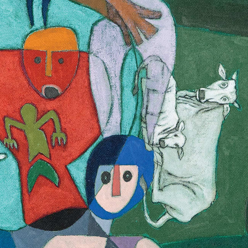 Read MoreThis artwork is part of a series titled 'The Eight Myths'. The hexagonal paintings in this series are rendered with a unique amalgam of local myths and fairy tales infused with fear and fun, that have been shared in rural areas since ages. To render the riddled narratives, Laxman Aelay has used folk and tribal art motifs and contours, by improvising and enhancing the imagery that he often sketches during leisure. What comes out of the paintings is the artistic freedom and simplified symbolism of complex oral narratives.