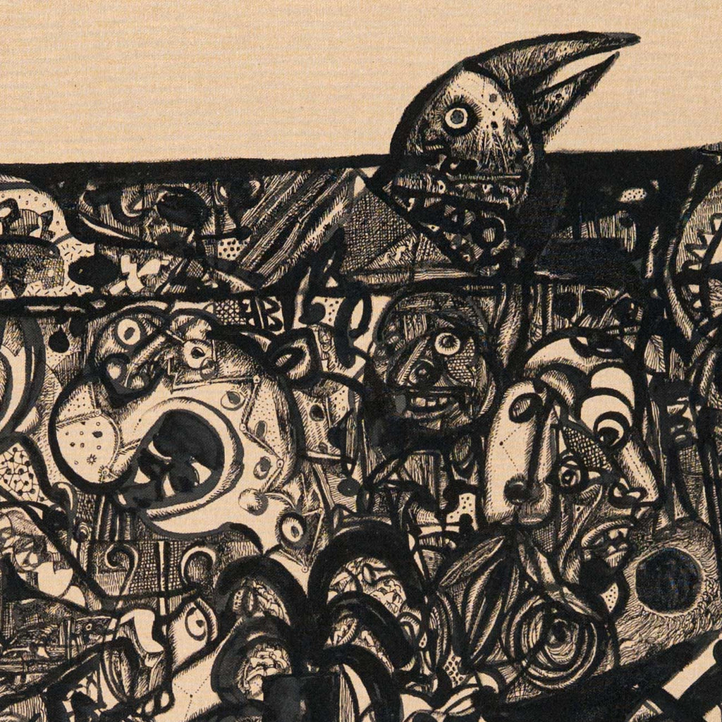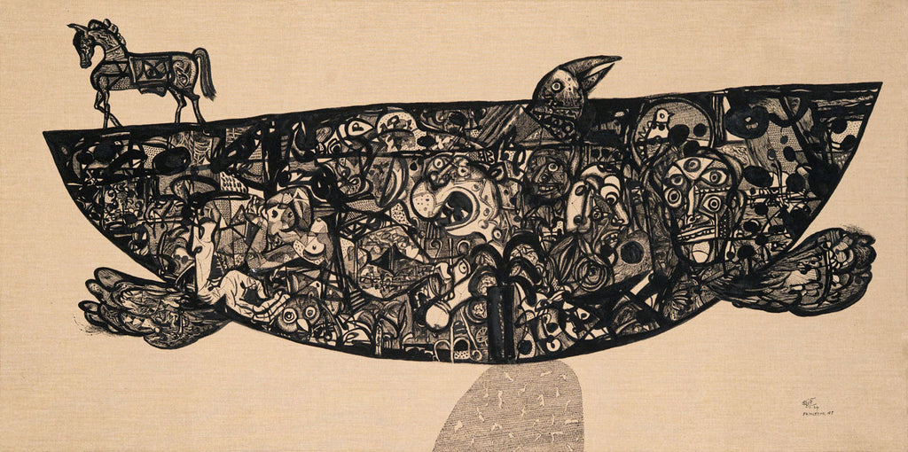 Read MoreUnfolding as a metaphorical journey through time and memory, the boat becomes a floating world that is part ark, part myth, part collective dream. Within the vessel reside fragments of human history, mythology, and personal echoes. The horse above suggests endurance, pride, and the spirit of an eternal traveller. Each face, creature, and pattern within the boat embodies the layered narratives of existence and of migration. The bird-like form evokes both fragility and freedom, holding the delicate tension between survival and flight. The surrounding emptiness deepens the silence of the journey, amplifying its introspective pull. Through intricate black lines, Laxman captures the rhythm of hope amid uncertainty. The work finally is symbolic of a voyage through memory, a search for home within the vast expanse of being.