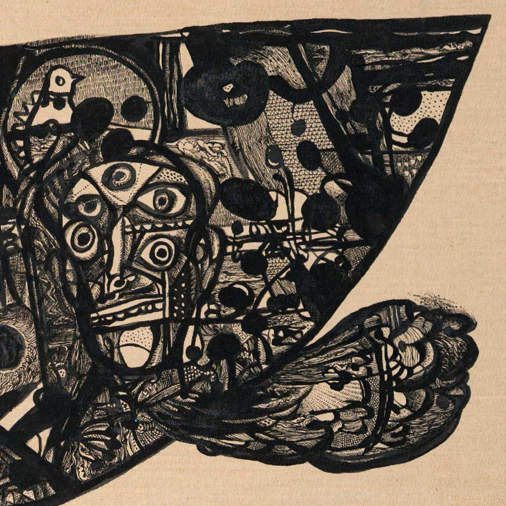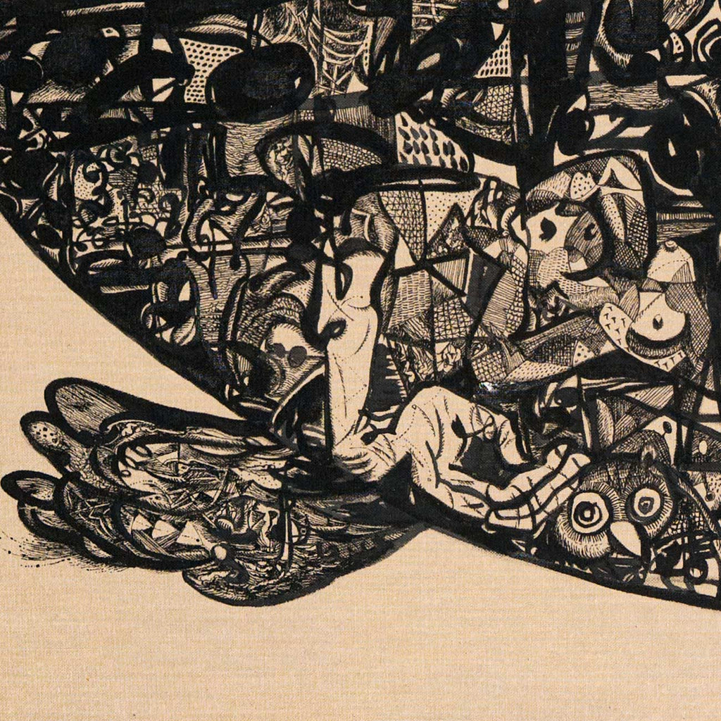 Unfolding as a metaphorical journey through time and memory, the boat becomes a floating world that is part ark, part myth, part collective dream. Within the vessel reside fragments of human history, mythology, and personal echoes. The horse above suggests endurance, pride, and the spirit of an eternal traveller. Each face, creature, and pattern within the boat embodies the layered narratives of existence and of migration. The bird-like form evokes both fragility and freedom, holding the delicate tension between survival and flight. The surrounding emptiness deepens the silence of the journey, amplifying its introspective pull. Through intricate black lines, Laxman captures the rhythm of hope amid uncertainty. The work finally is symbolic of a voyage through memory, a search for home within the vast expanse of being.