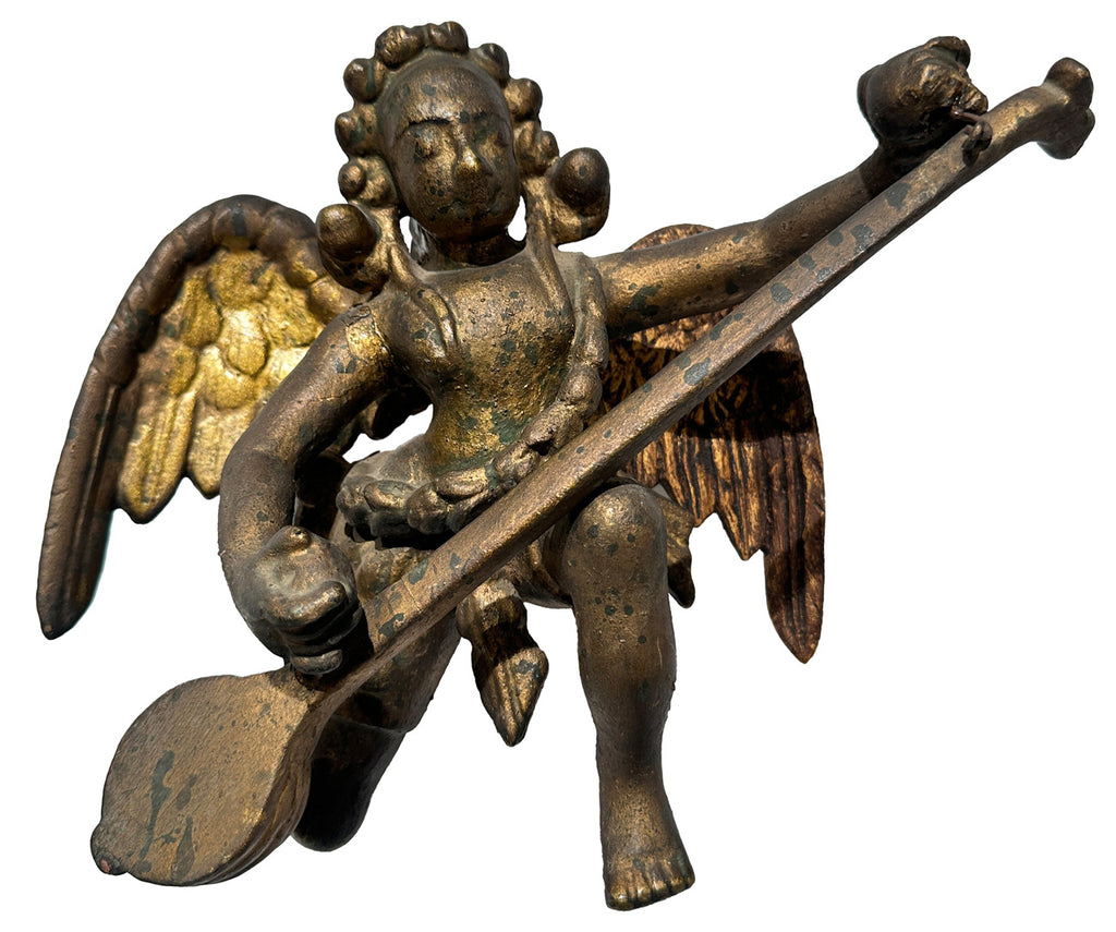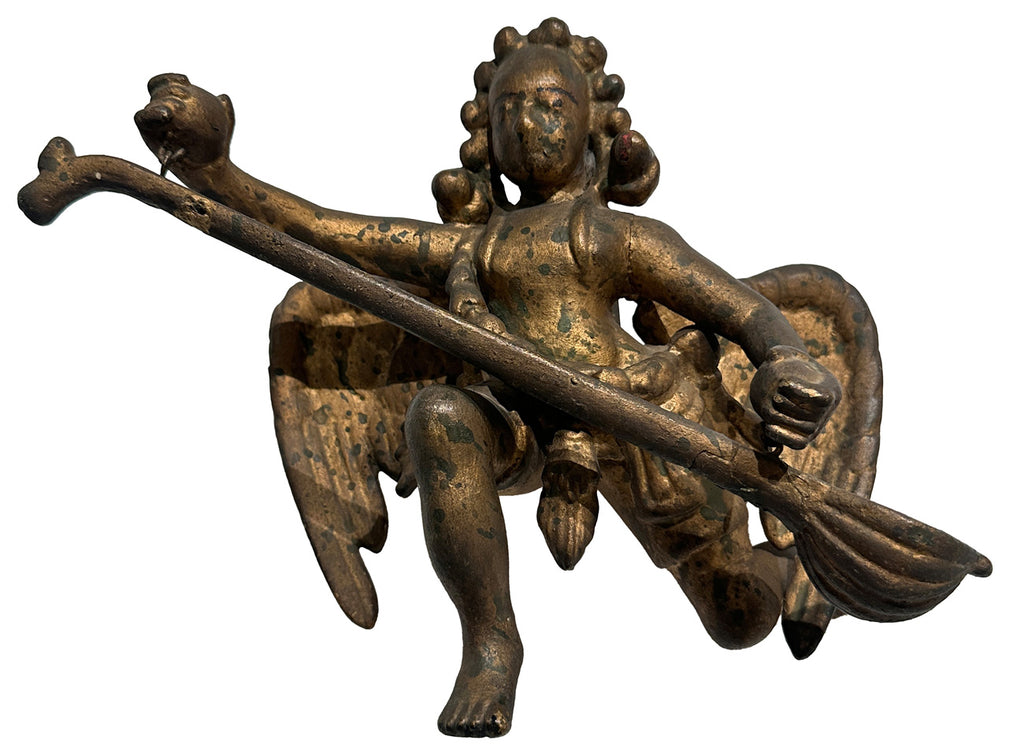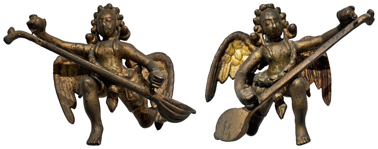 Read MorePair of winged Apsaras playing Veenas from Tamil Nadu. Apsaras are celestial nymphs in Hindu and Buddhist culture. They are described as beautiful, youthful and elegant, and are said to be able to change their shape at will. They are masters in the art of dancing, and often wives of the Gandharvas, the court musicians of the king of the gods, Indra. Apsaras figure prominently in the sculpture, dance, literature and painting of many Indian and South-East Asian cultures.